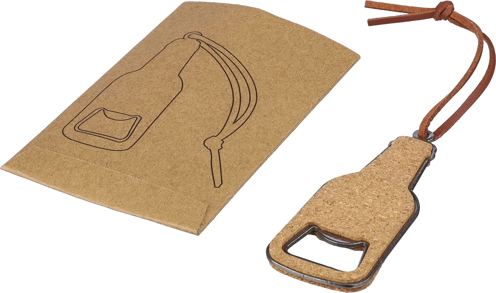 Abre-cápsulas de cortiça com detalhes em aço inoxidável e cortiça de duas faces. Inclui um cordão em PU. Embalado individualmente numa bolsa de papel castanho.