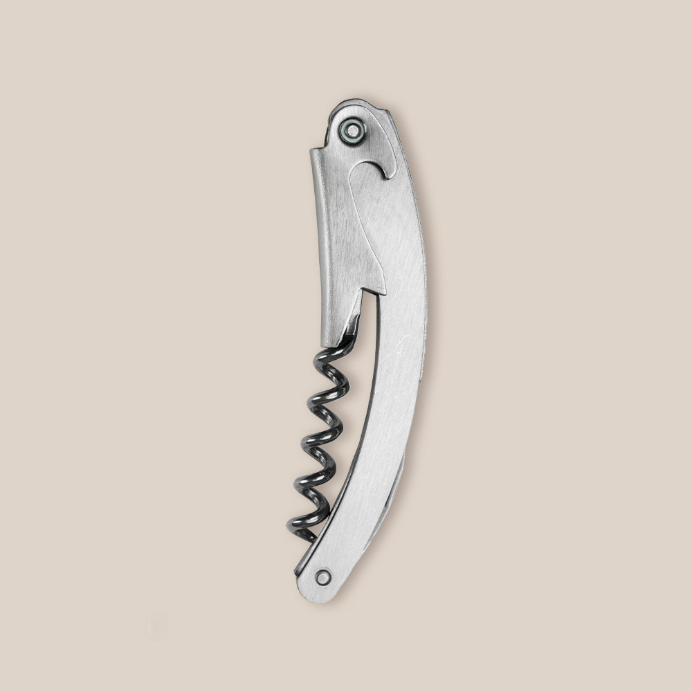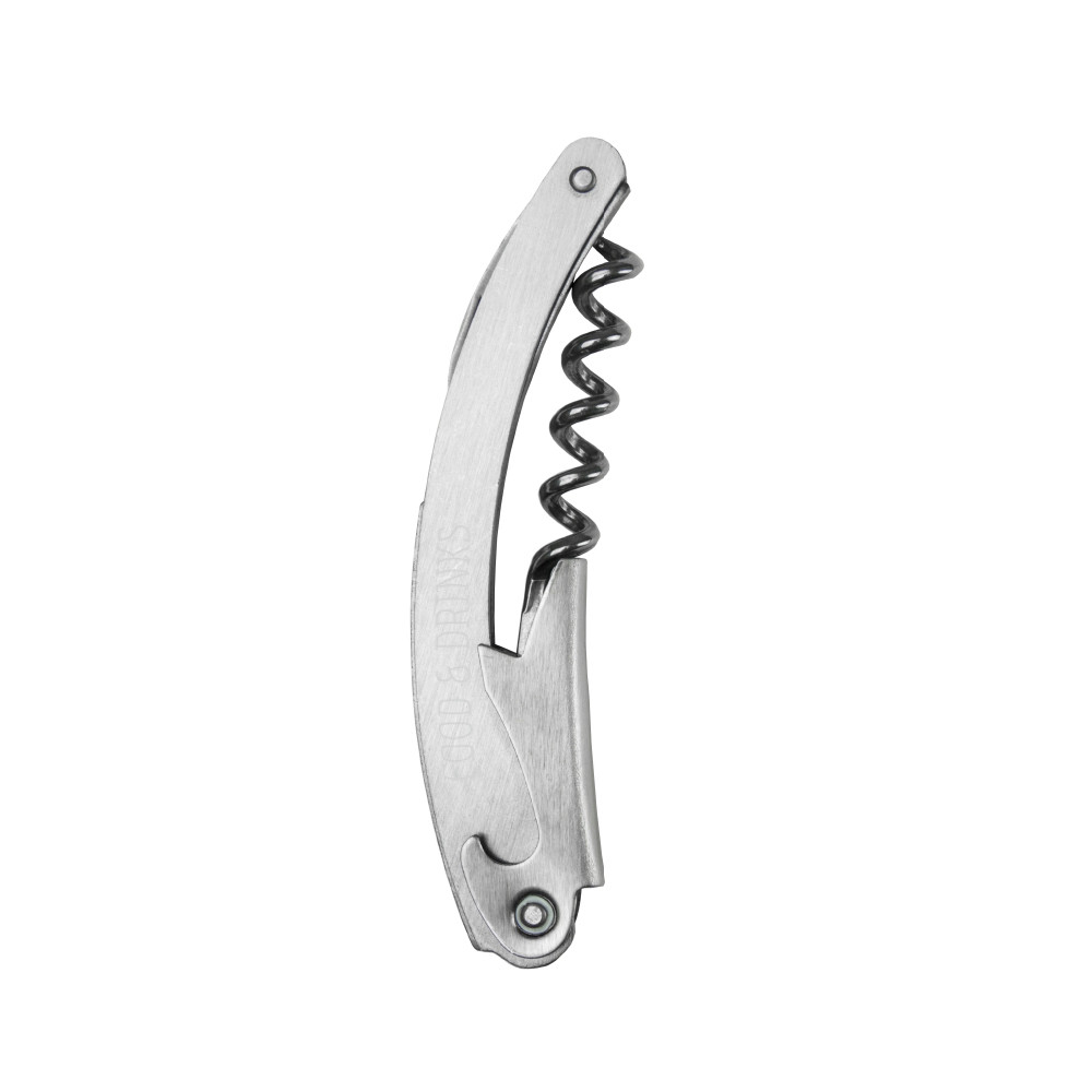Abridor metálico, cómodo e maneável, para abrir garrafas facilmente.