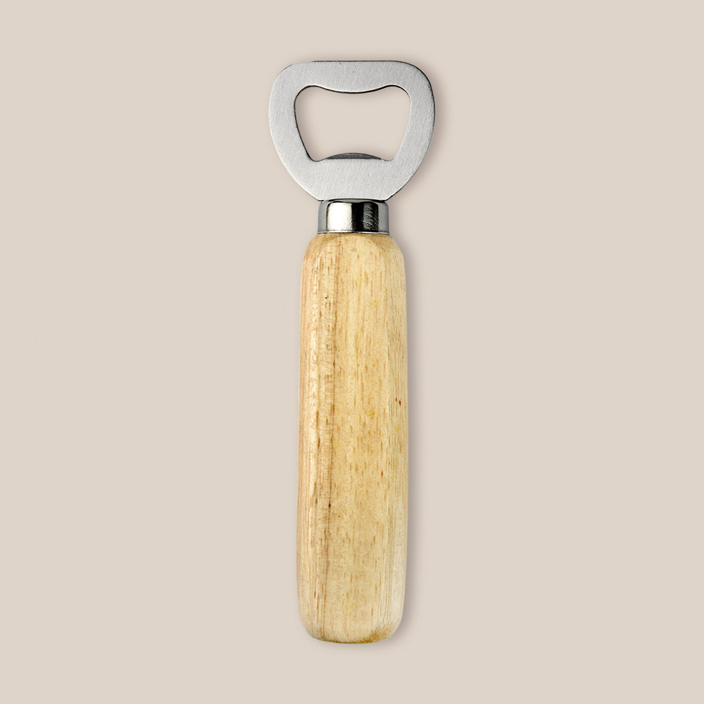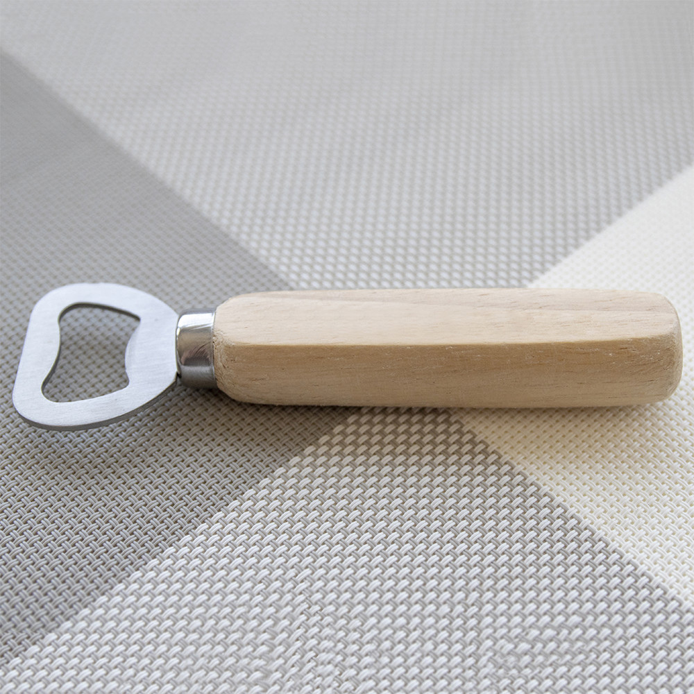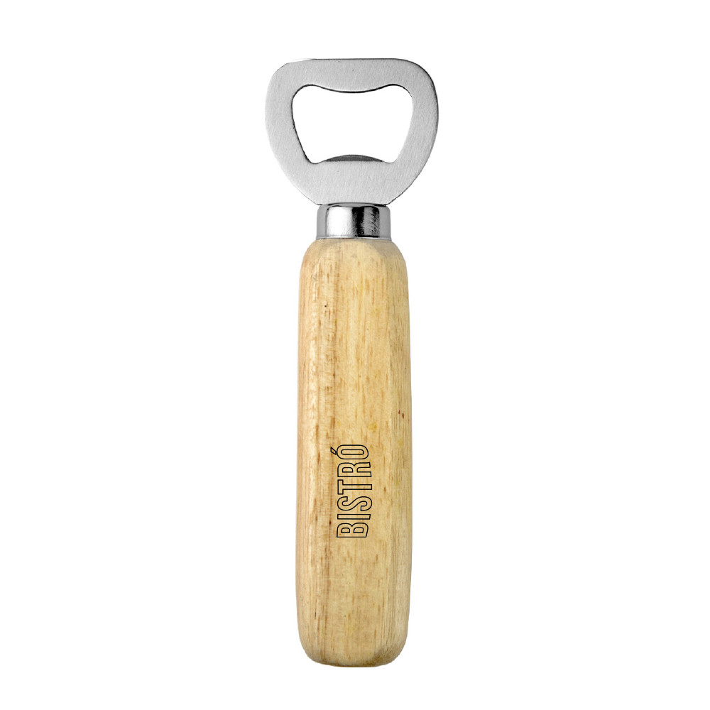 Abridor de garrafas fabricado em aço inoxidável e punho de madeira.
