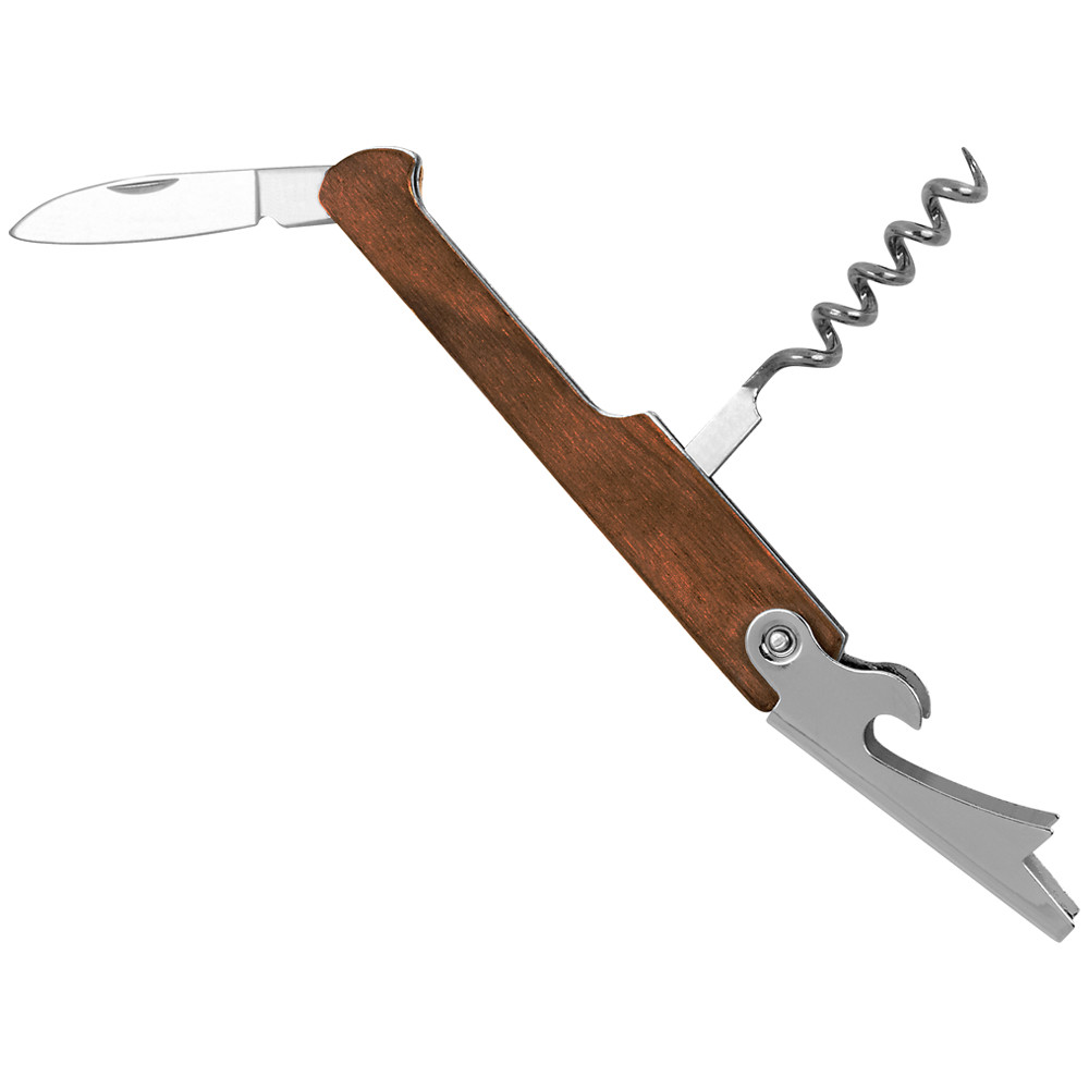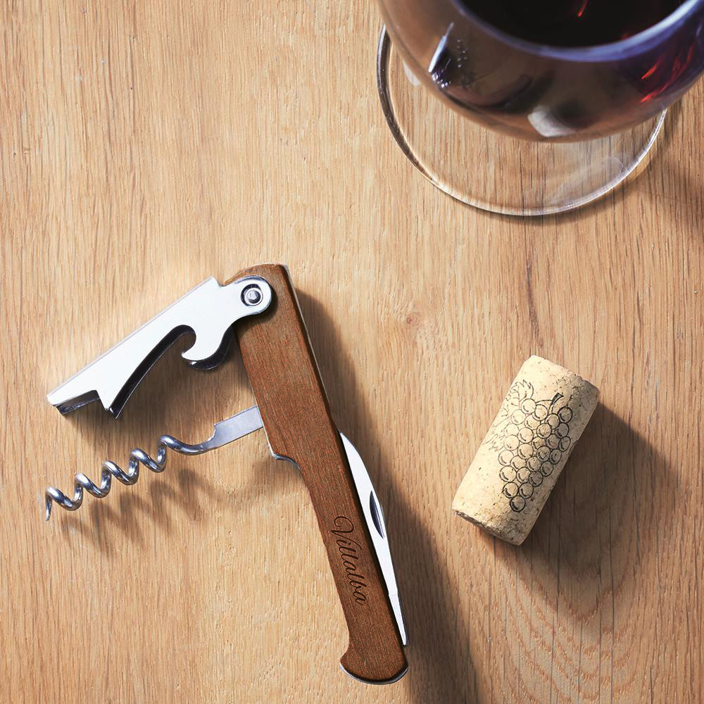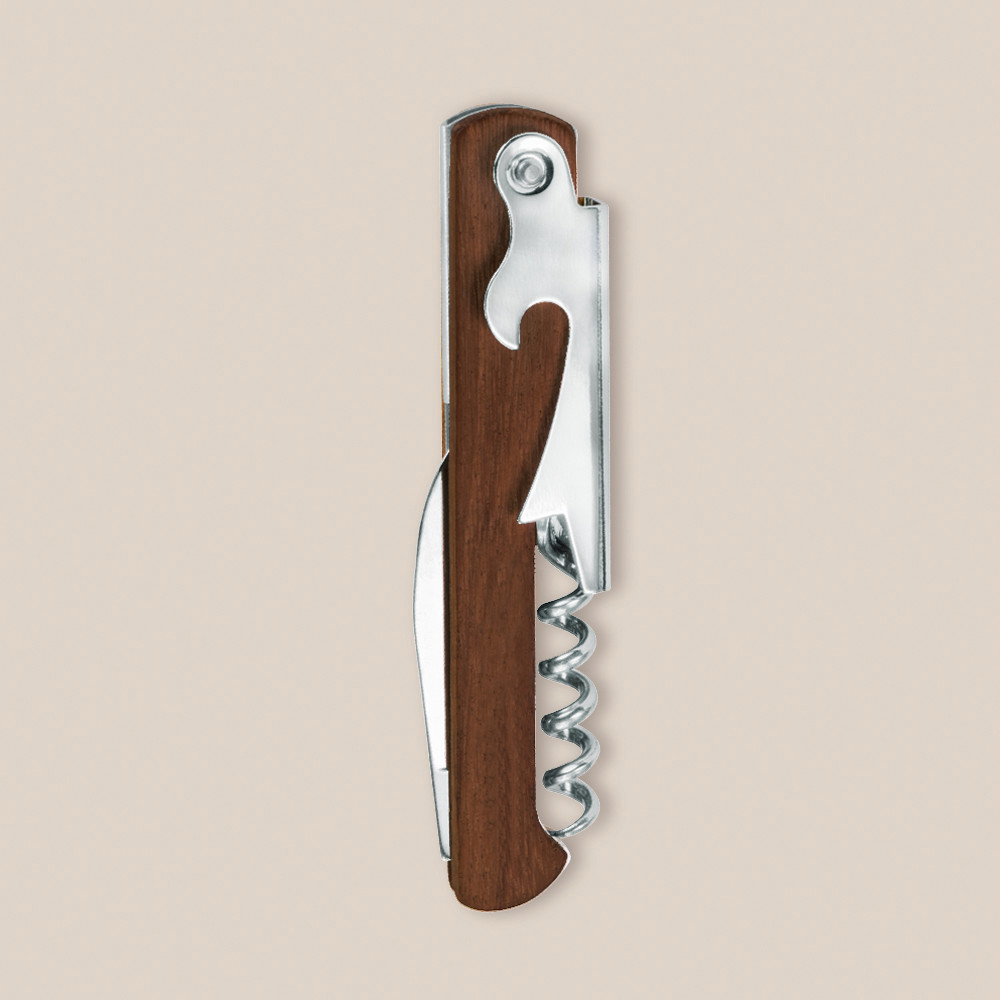 Abridor de garrafas fabricado em aço inoxidável com pega fabricada em madeira natural