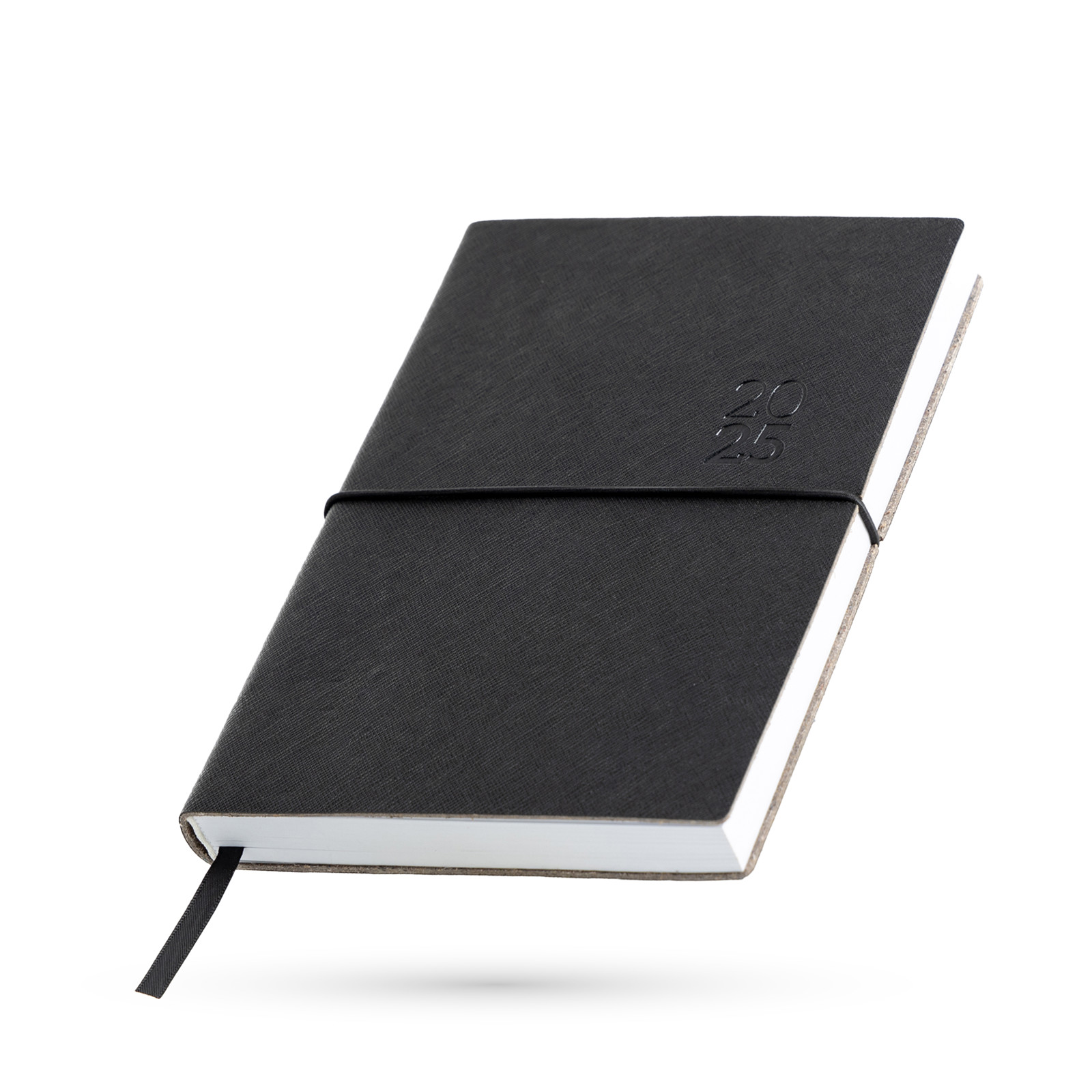 Milano - Agenda diária A5. Capa em mistura de pele com 67% fibras naturais , elástico tubular horizontal e fitilho preto. Com 336 páginas , em papel branco 70g, papel proveniente de florestas geridas de forma responsável. Idiomas principais: Português e Espanhol. No interior inclui: espaço para preenchimento de dados pessoais; calendário completo de 2026 e semestre de 2025 e 2027; feriados em lista; plano de férias; plano diário 2026 e espaço para preenchimento de contactos importantes (de A-Z).