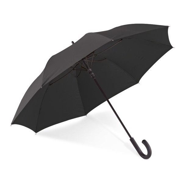 Guarda-chuva em pongee 190T com cabo e varetas em fibra de vidro e pega revestida a borracha. O guarda-chuva é à prova de vento e tem abertura automática. ø1030 x 890 mm