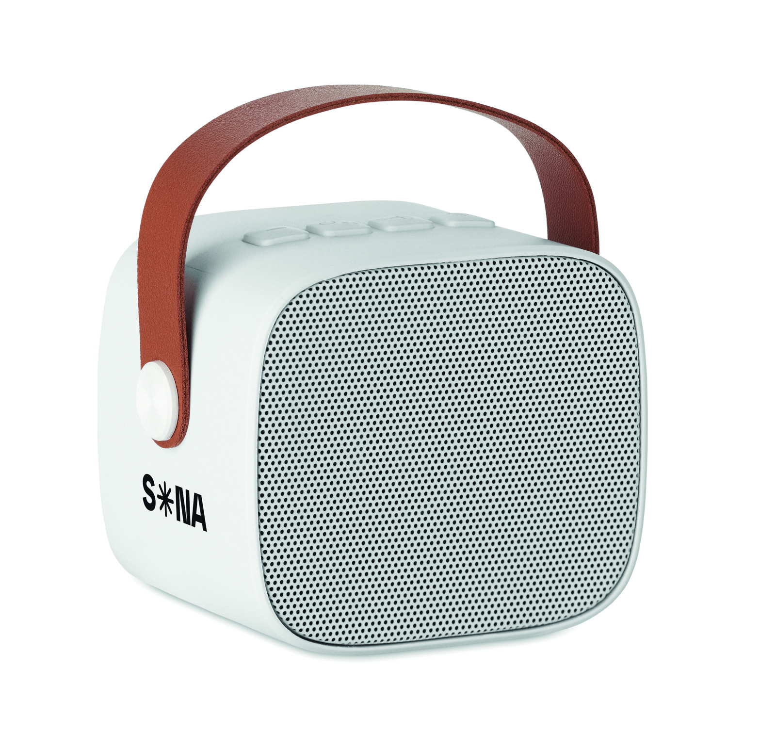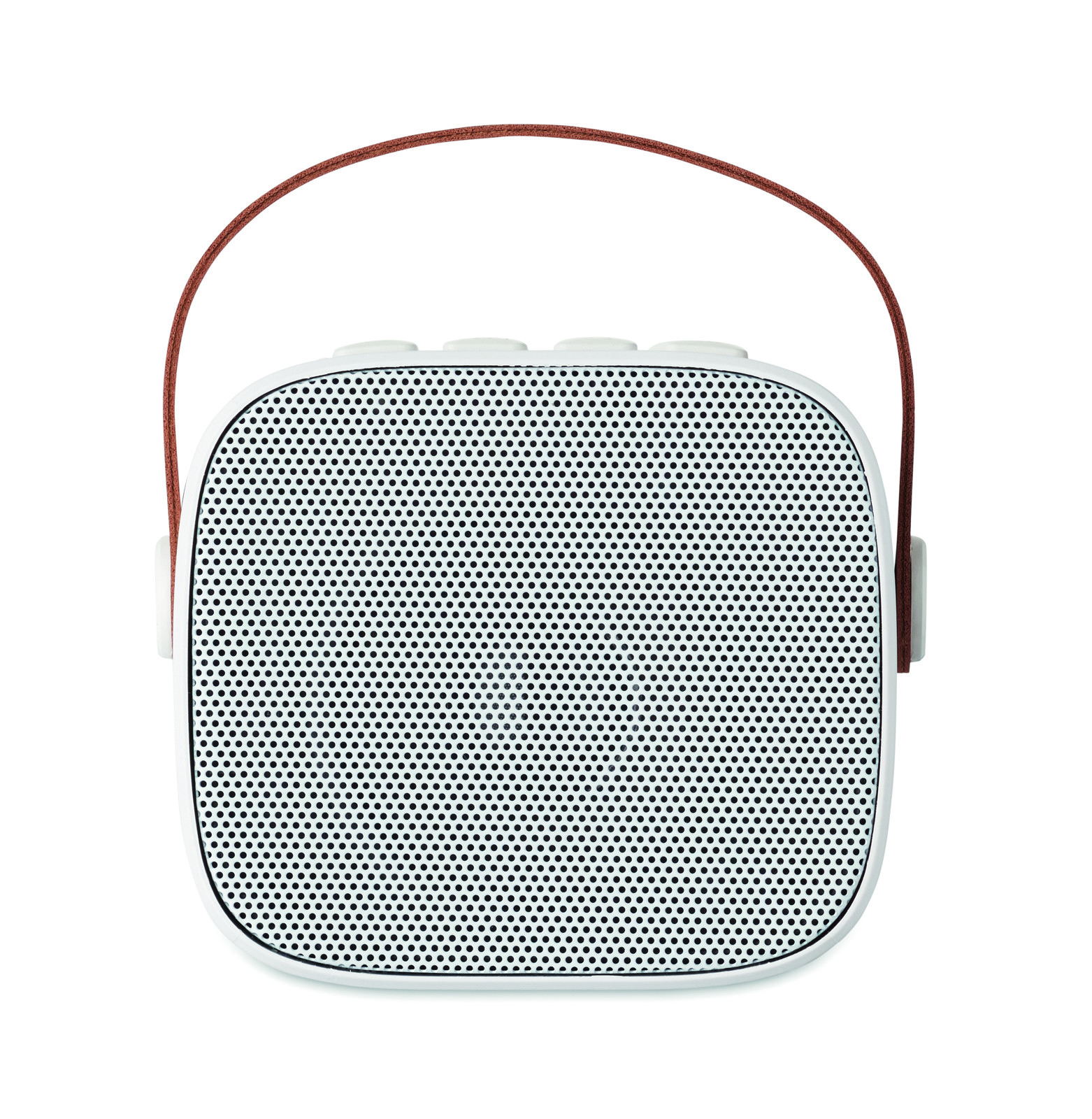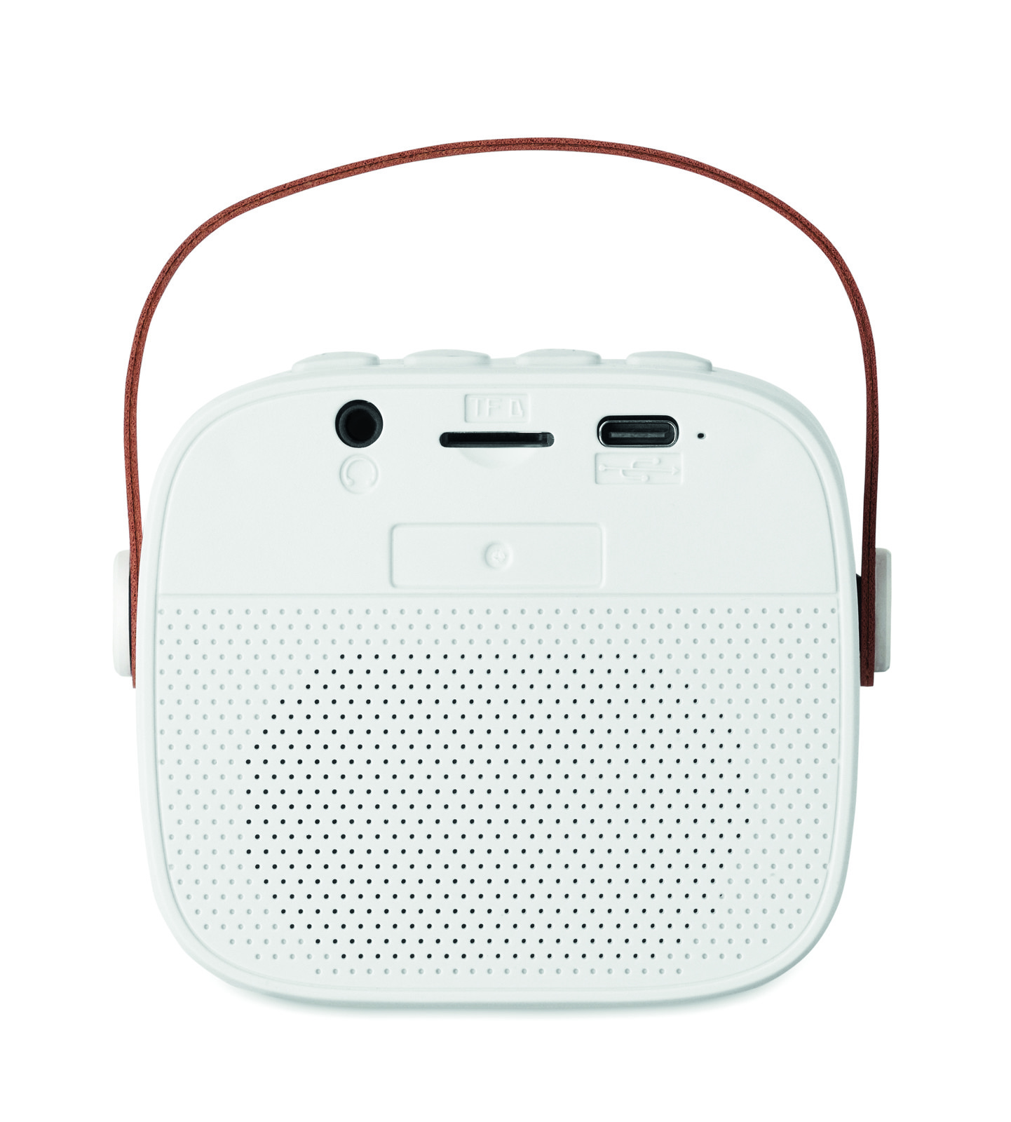 Altifalante 5.0 sem fios em ABS reciclado com pega em PU. 1 bateria recarregável de iões de lítio de 500 mAh incluída. Inclui uma porta para cartão SD e um cabo AUX/USB. Dados de saída: 5W, 3 Ohm e 5V. Tempo de reprodução: aprox. 4h.