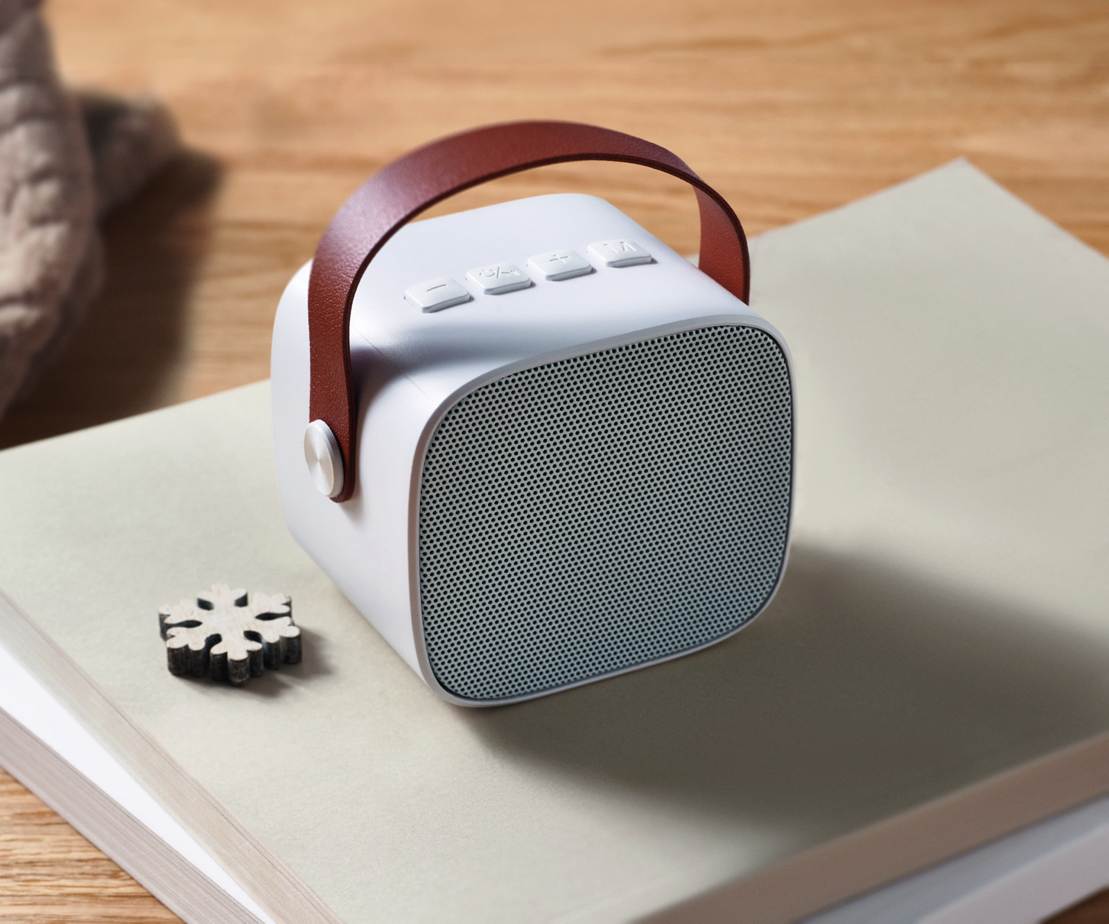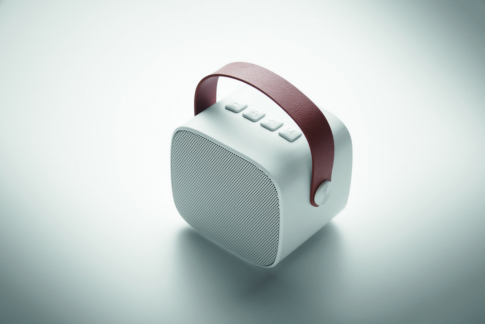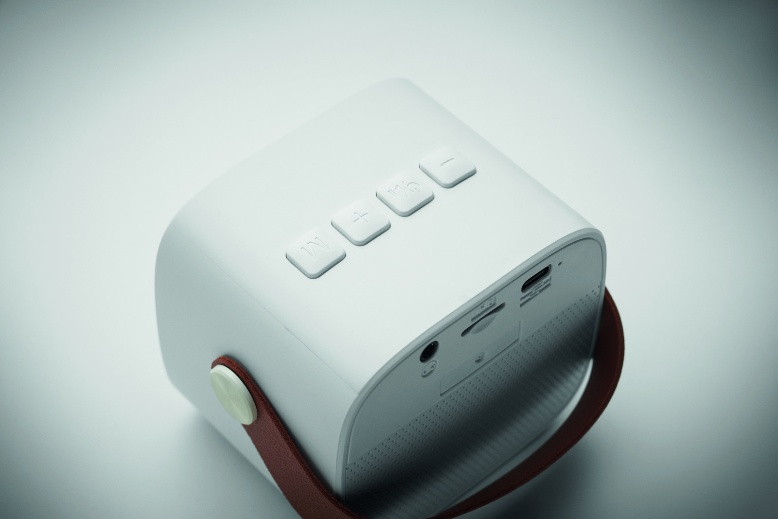 Altifalante 5.0 sem fios em ABS reciclado com pega em PU. 1 bateria recarregável de iões de lítio de 500 mAh incluída. Inclui uma porta para cartão SD e um cabo AUX/USB. Dados de saída: 5W, 3 Ohm e 5V. Tempo de reprodução: aprox. 4h.