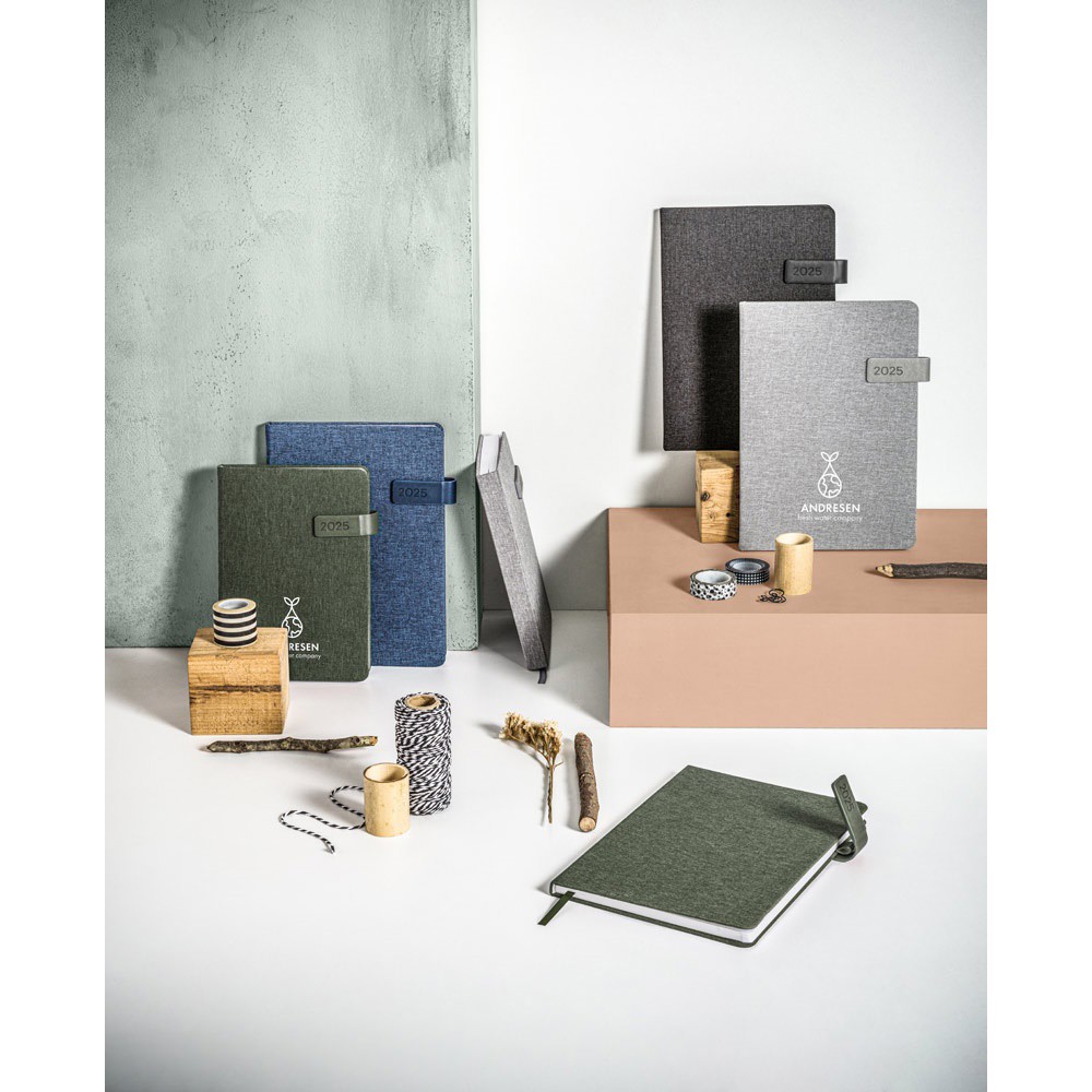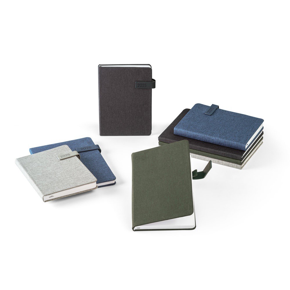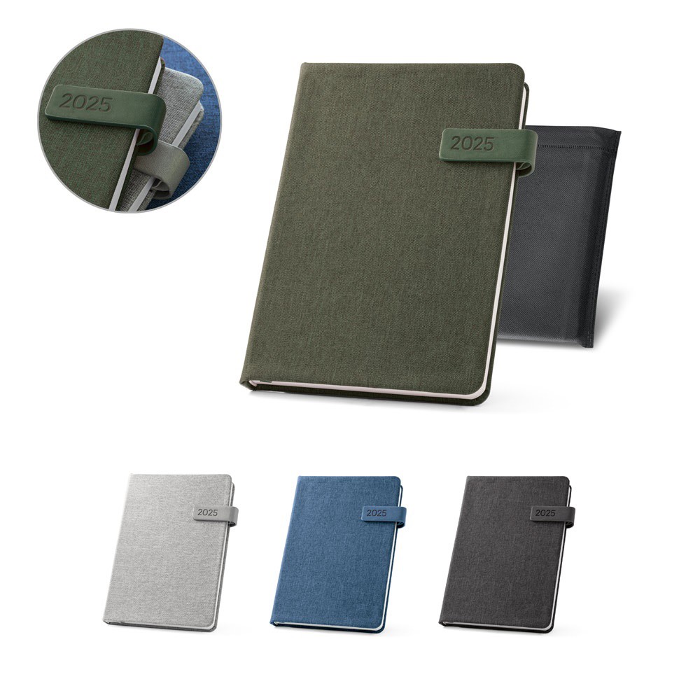 Agenda A5 em rPET com fecho magnético em PU, marcador em fita e suporte para esferográfica (não incluída). Está organizada num plano diário. Fornecida com bolsa de non-woven. 148 x 210 mm | Bolsa: 205 x 250 mm
