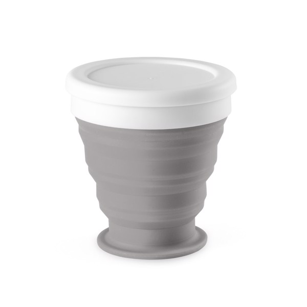 Copo de viagem dobrável em silicone com tampa em PP. Contém uma pega na tampa. Copo com capacidade até 250 mL. ø88 x 85 mm