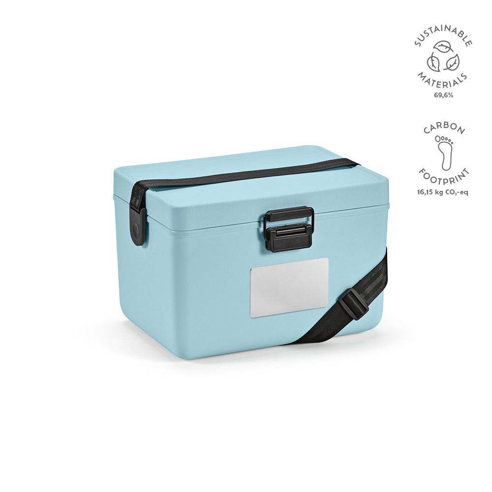 A caixa térmica Bangkok é atrativa e tem capacidade de 12L feita de plástico reciclado, com fecho frontal de fivela e alça de ombro ajustável. Fornecida com uma placa metálica (14 x 7 cm) para fácil personalização. Ideal para manter as bebidas frescas quando em movimento, durante acampamentos ou num dia de praia. Disponível em três tons pastel e preto. Capacidade para 18 latas.
