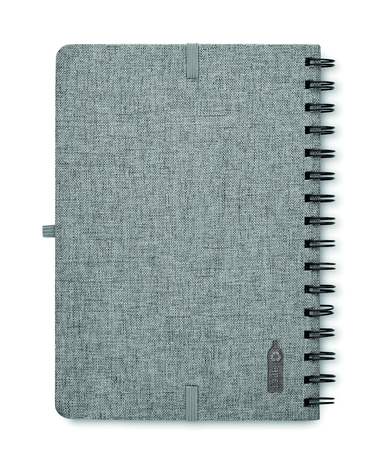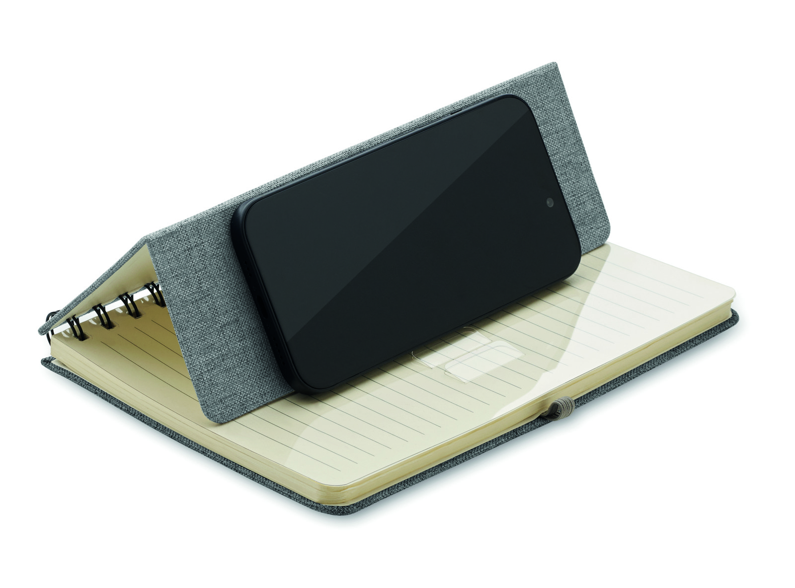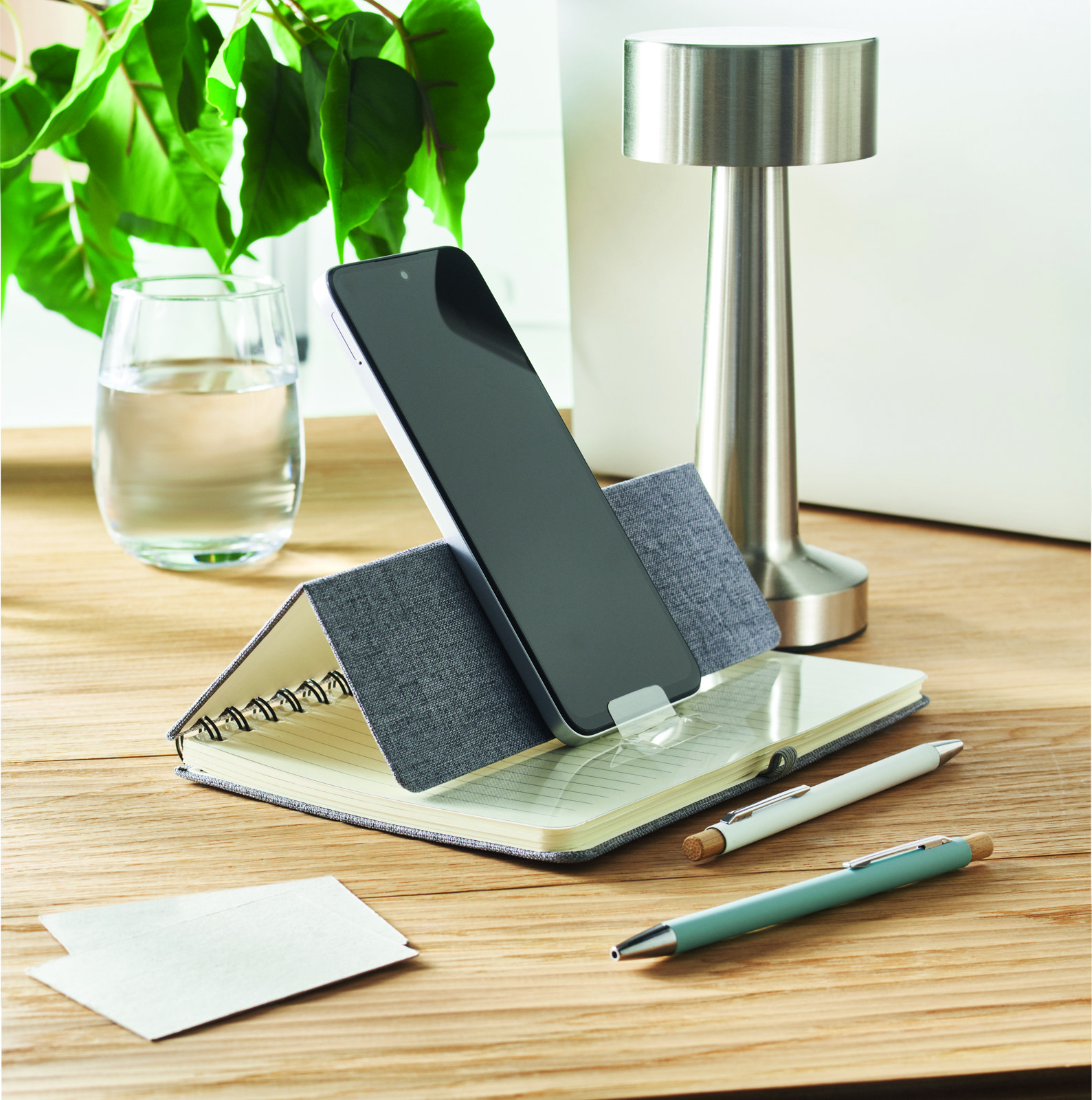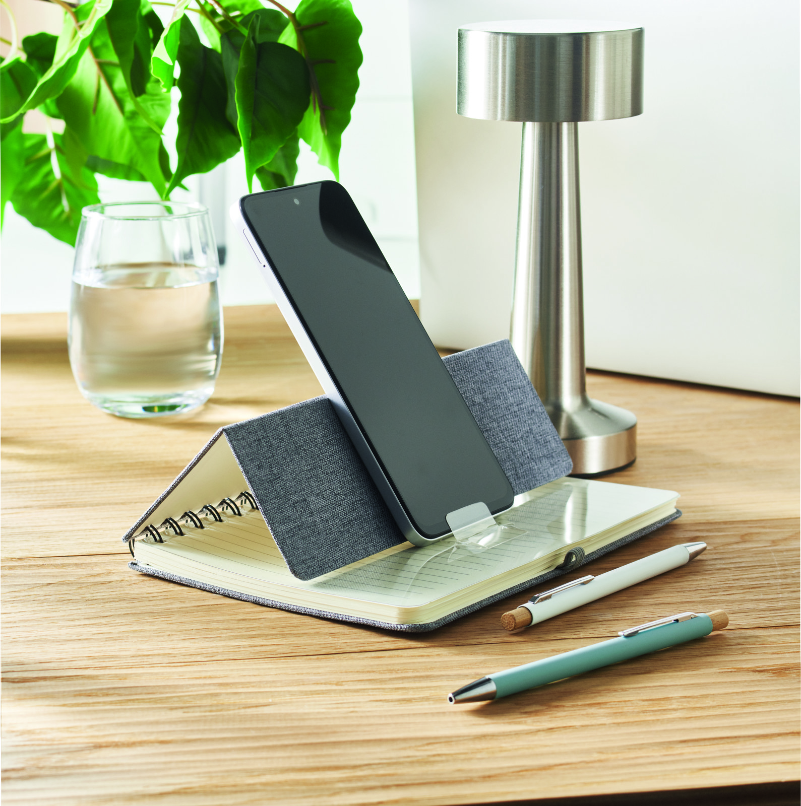 Bloco de notas A5 com capa rígida 600D RPET com função de suporte para smartphone. Fio duplo. 160 páginas pautadas (80 folhas). papel reciclado de 70 g/m². Fecho elástico.