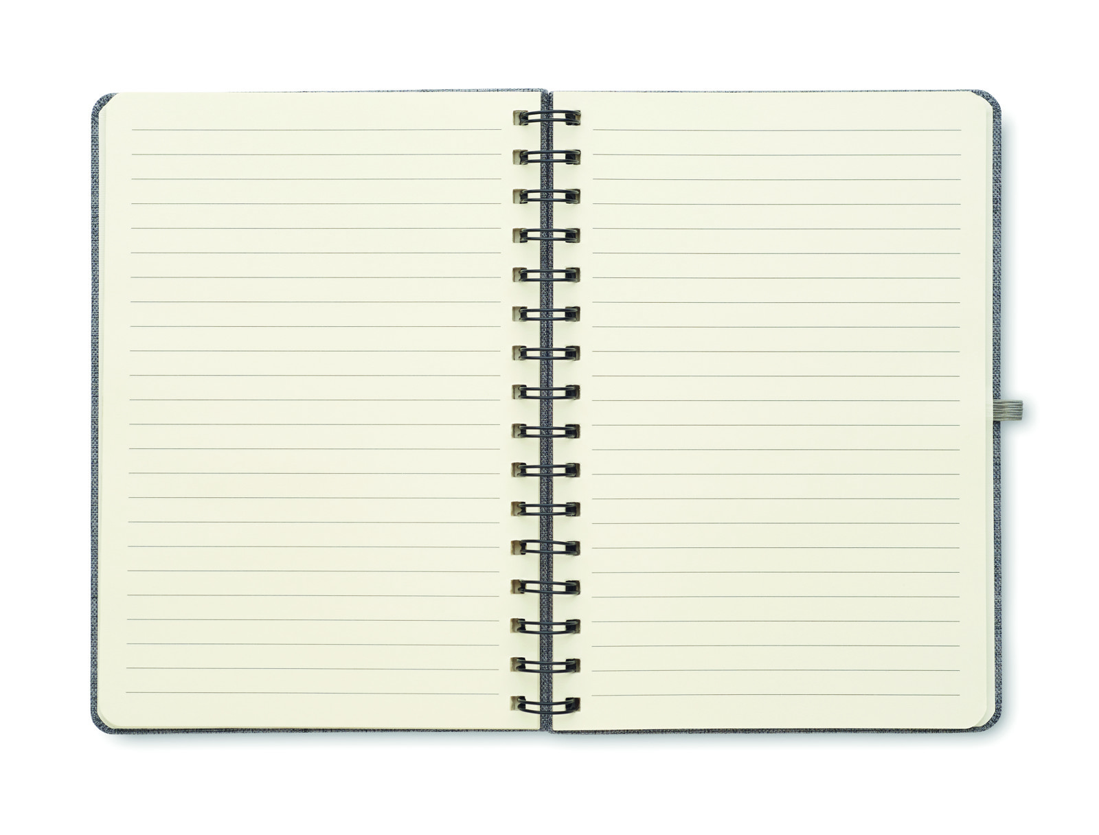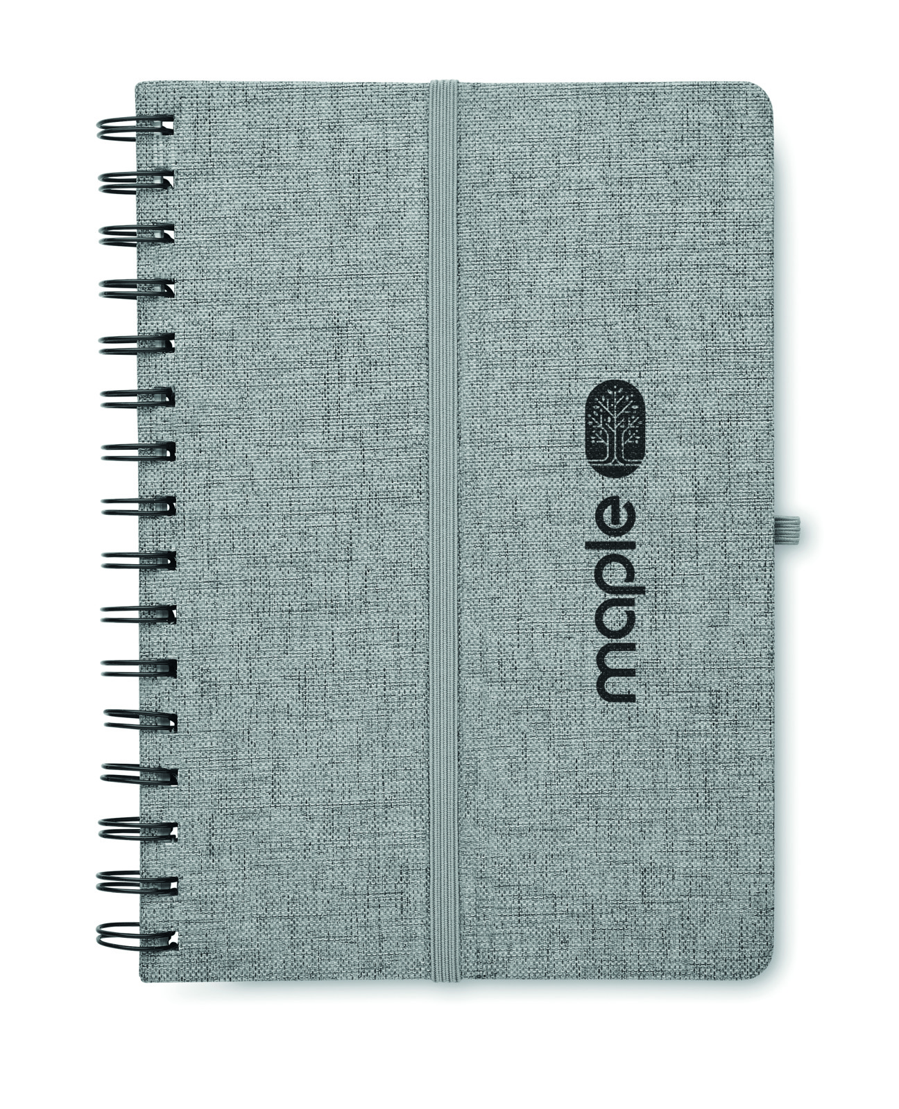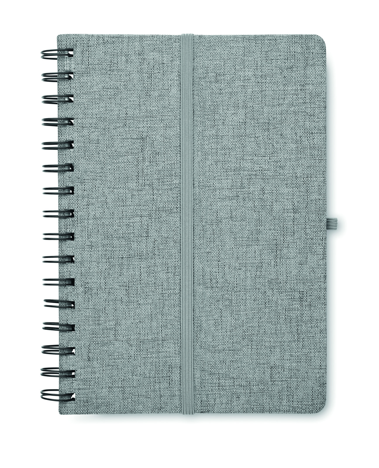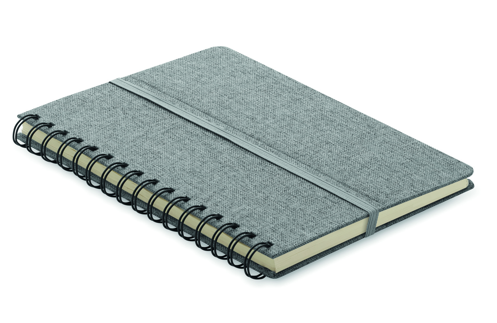 Bloco de notas A5 com capa rígida 600D RPET com função de suporte para smartphone. Fio duplo. 160 páginas pautadas (80 folhas). papel reciclado de 70 g/m². Fecho elástico.