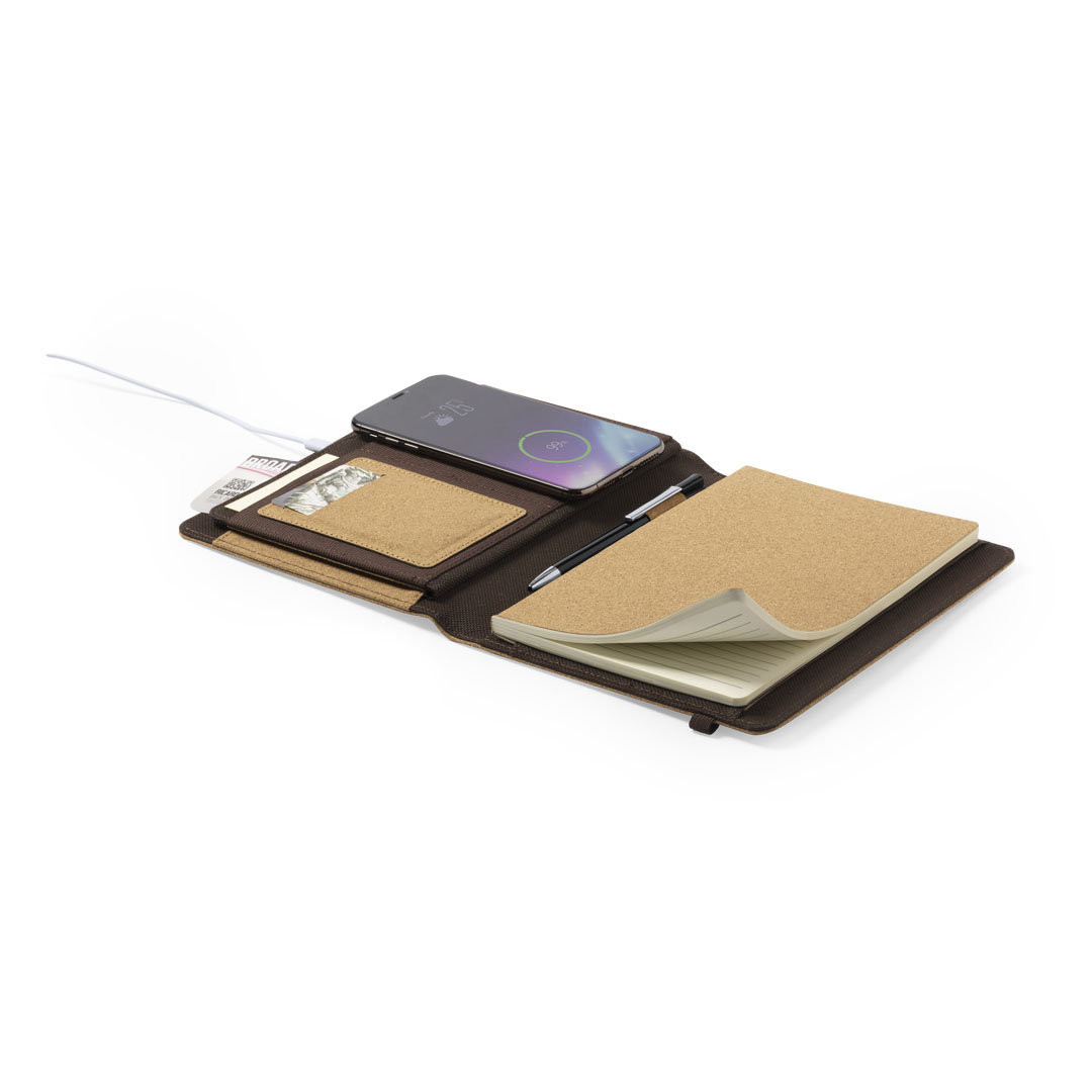 Linha da natureza no bloco de notas com carregador sem fio integrado. Capas em Cork Natural, em design sóbrio, com a estação de carregamento na contracapa. 64 folhas no bloco de lençóis com layout listrado. Compatível com dispositivos equipados com tecnologia de carregamento sem fio. Incluindo o cabo de carregamento micro USB e apresentado em uma atraente caixa de design Eco. Sem fios 5W. 64 Folhas