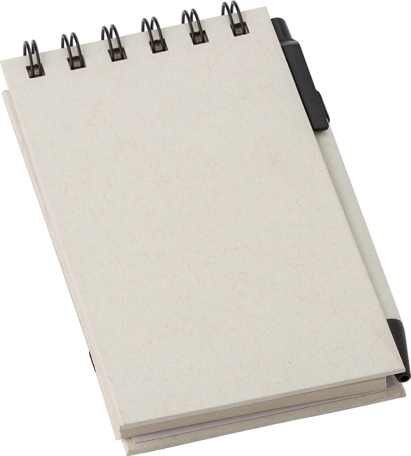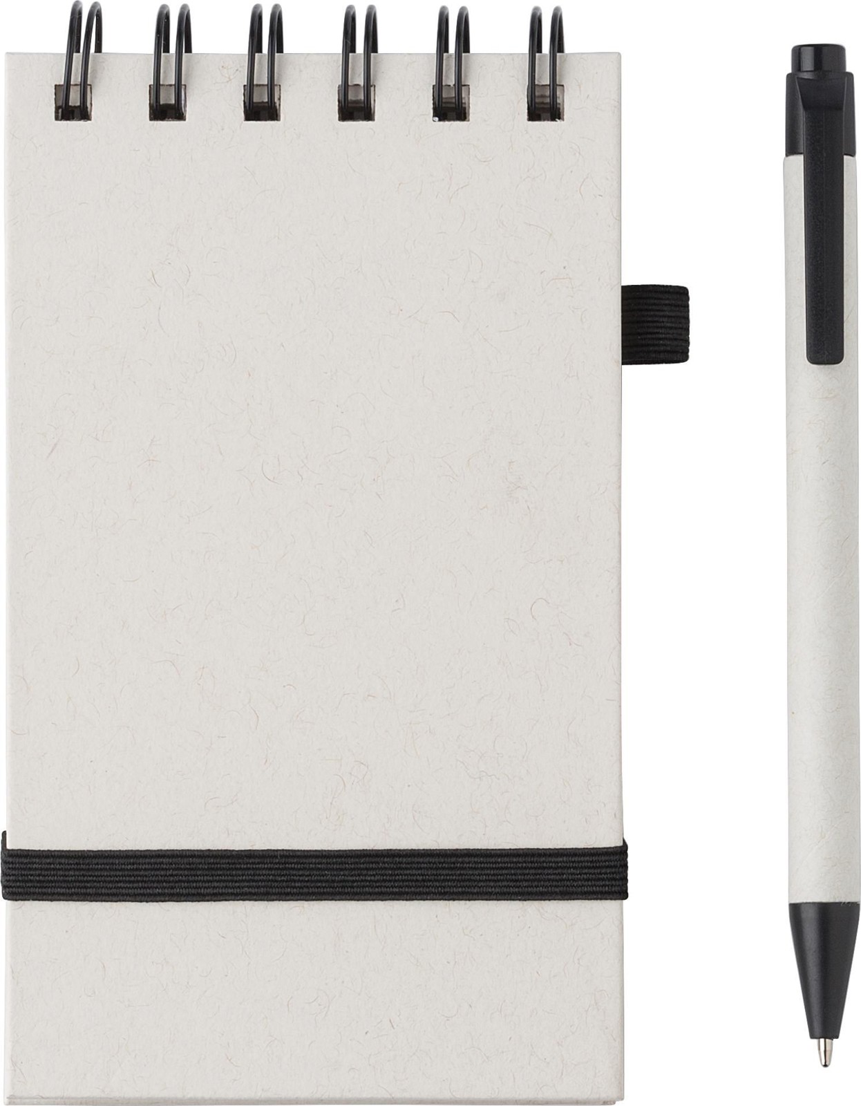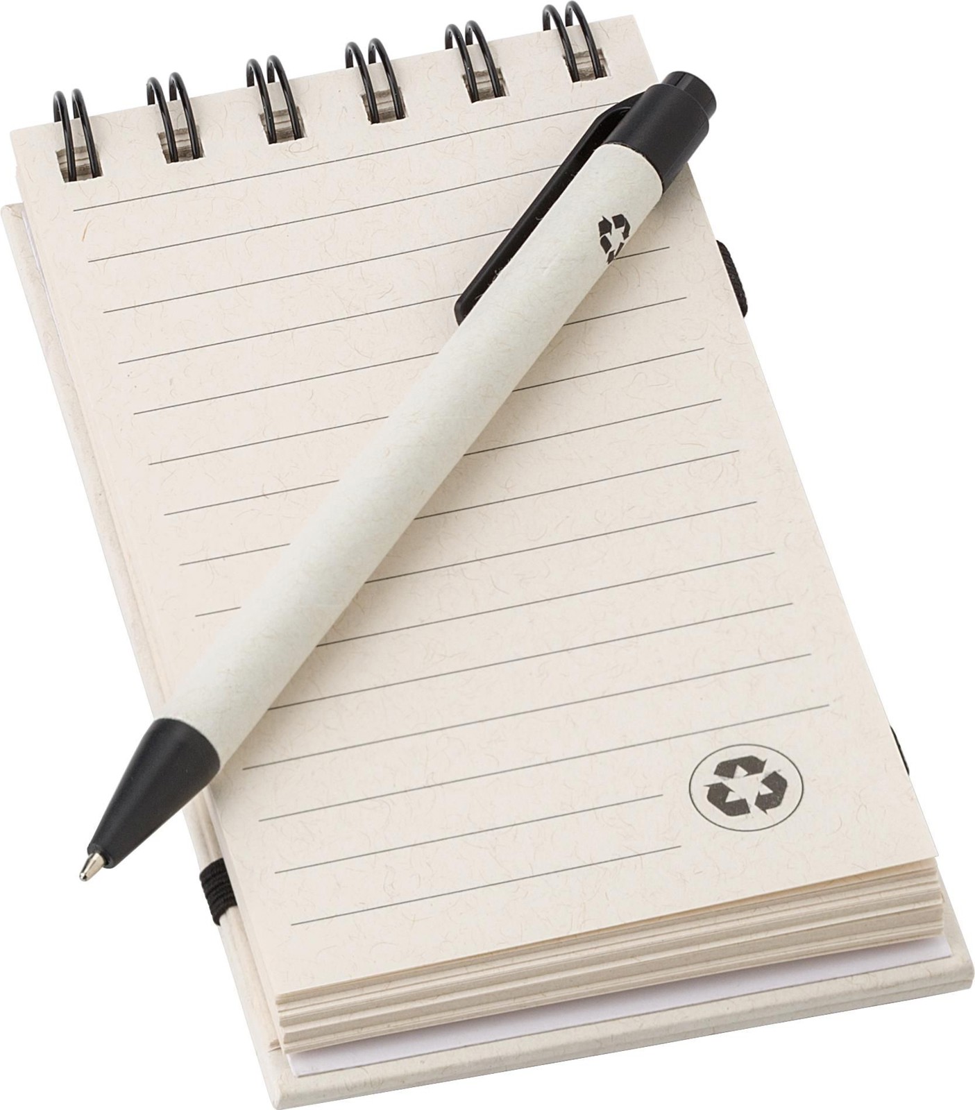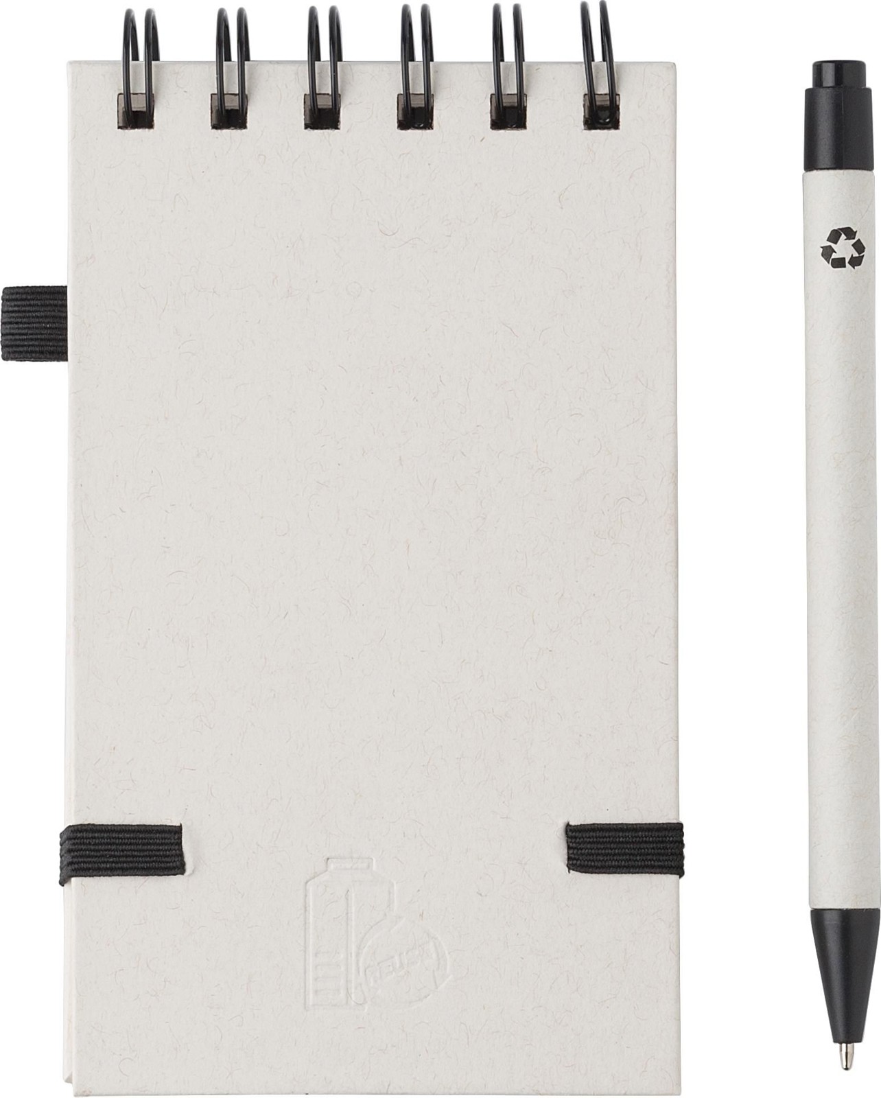 Caderno A6 com 70 páginas, elástico e suporte para esferográfica. Esferográfica a condizer com tinta azul. Fabricado com 70% de cartão de leite reciclado e 30% de papel reciclado. Inclui o logótipo do pacote de leite gravado a quente na contracapa.