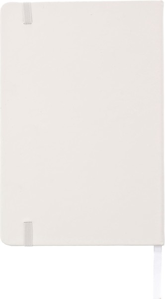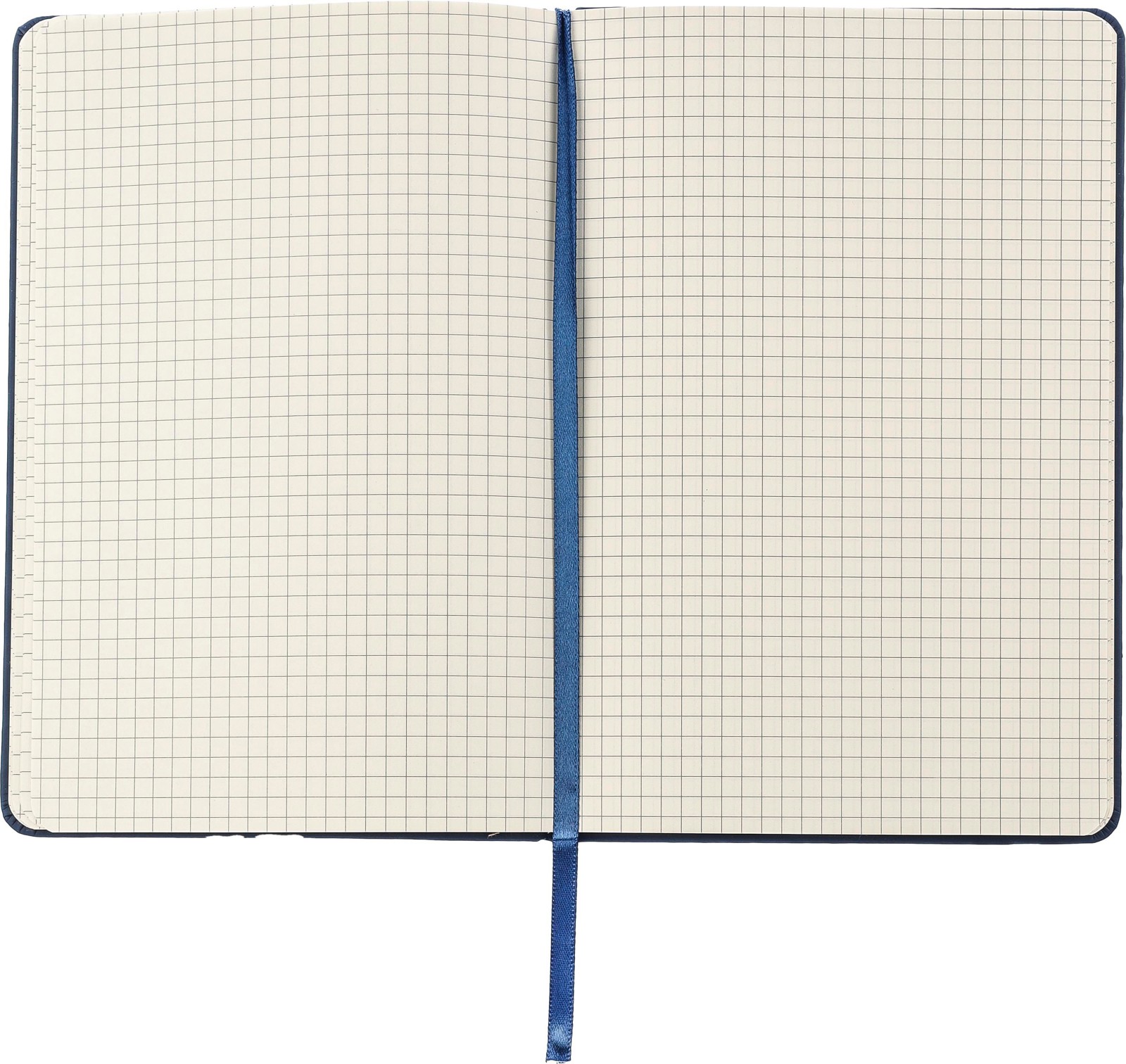 Bloco em PU (aprox. A5) com 96 páginas de quadrados quadriculados de 5 mm sem margem. Inclui um marcador de fita e um elástico na capa.