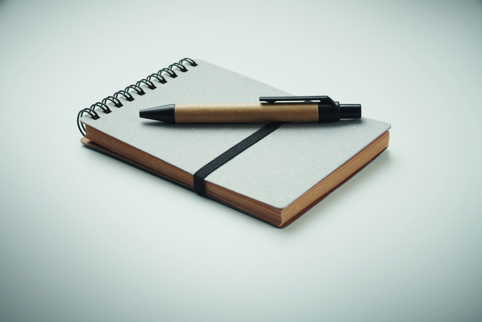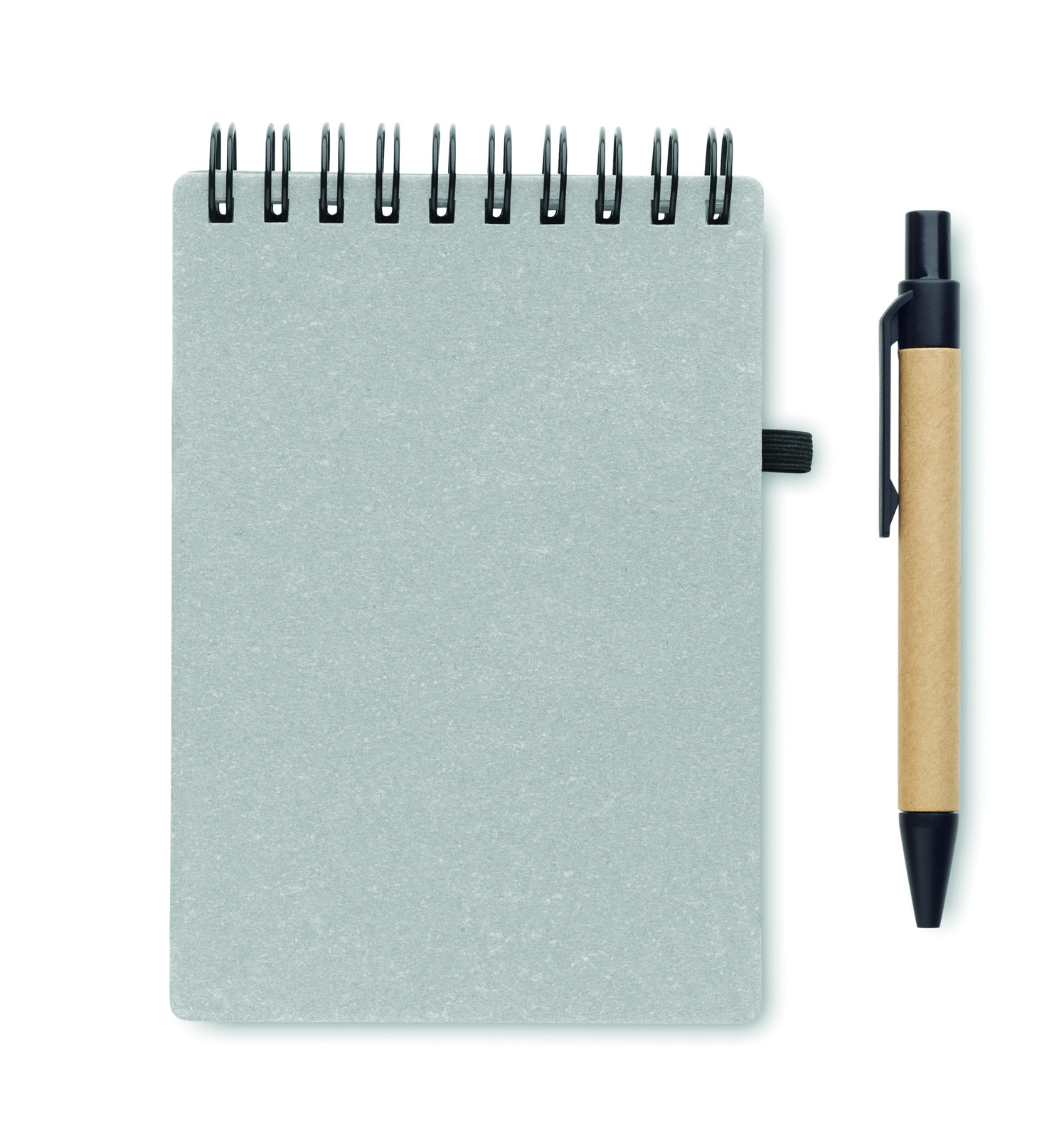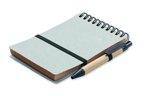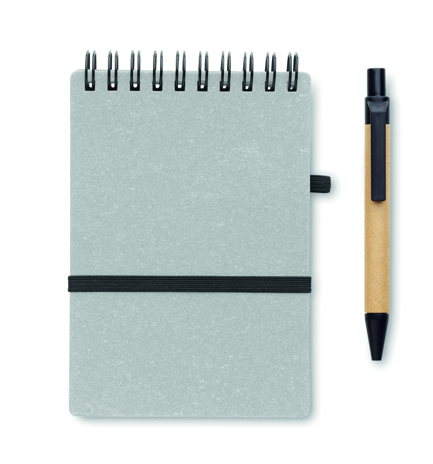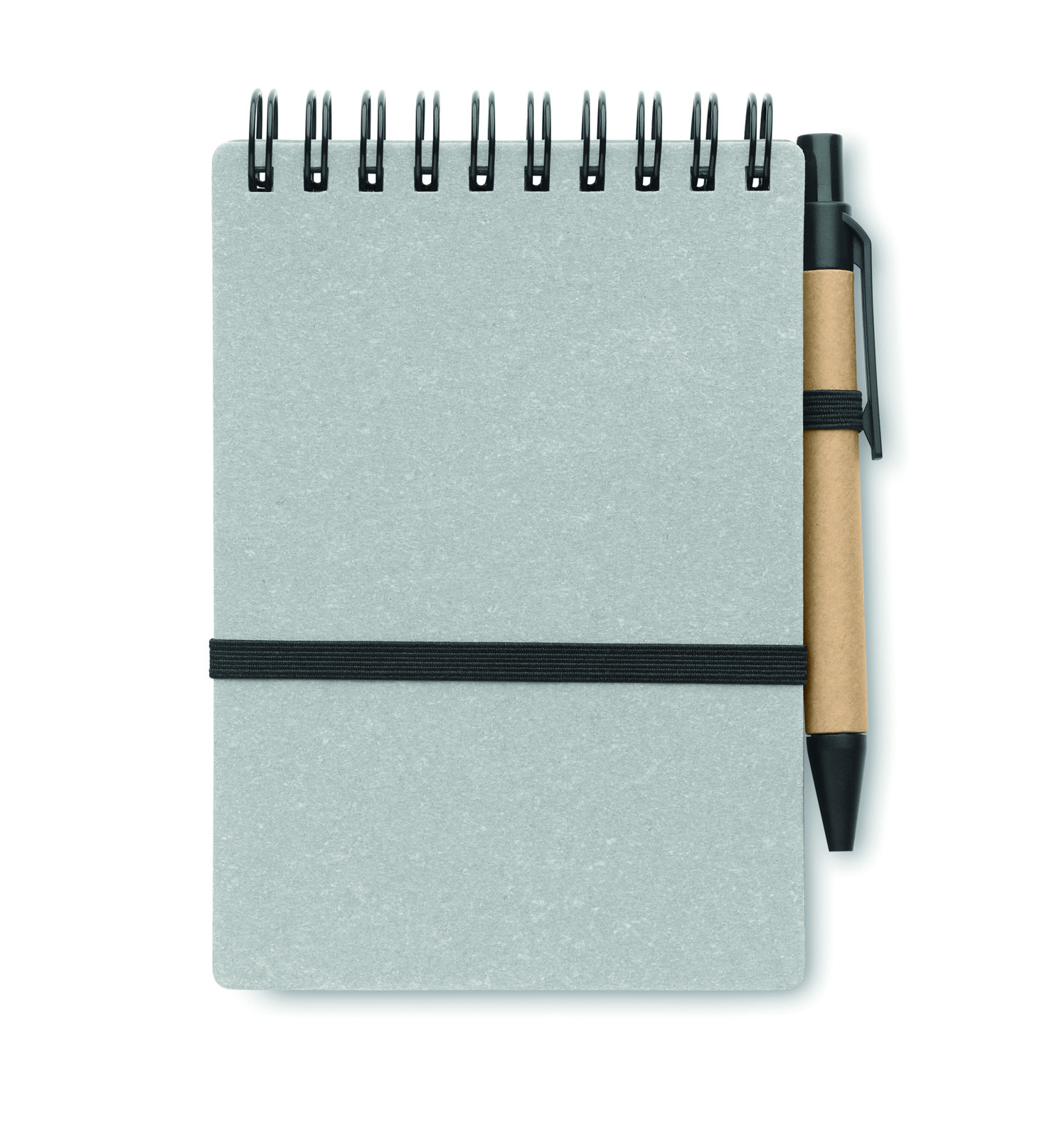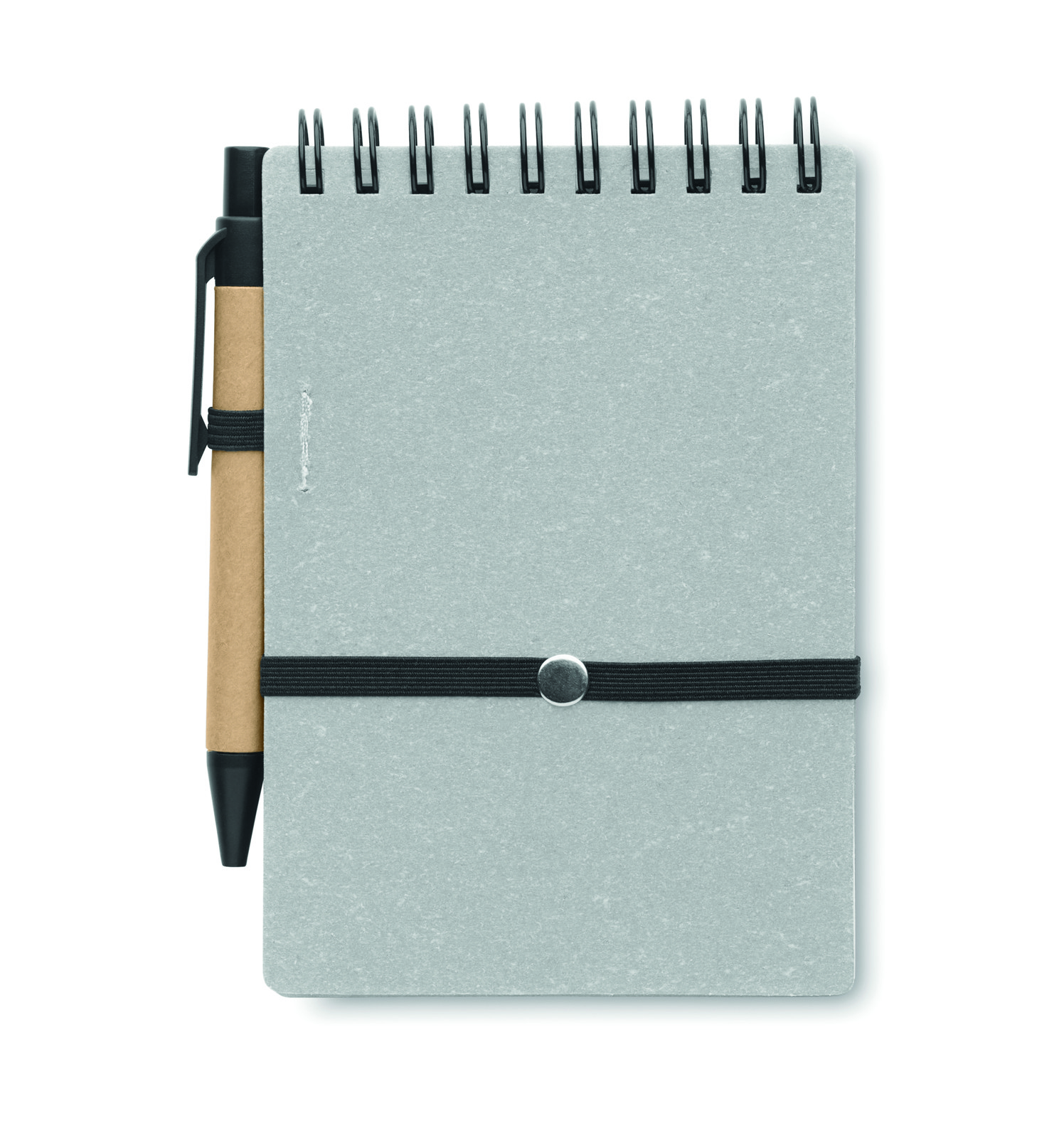 Bloco em papel reciclado e capa em PU (70% papel reciclado e 30% PU). Fio duplo. 140 páginas pautadas em papel reciclado (70 folhas). Caneta esferográfica com botão de pressão a condizer em cartão reciclado e ABS. Tinta azul. Alça elástica de fecho e suporte para caneta. FSC®-certified | FSC MIX CREDIT, P7.1, FSC-C213206