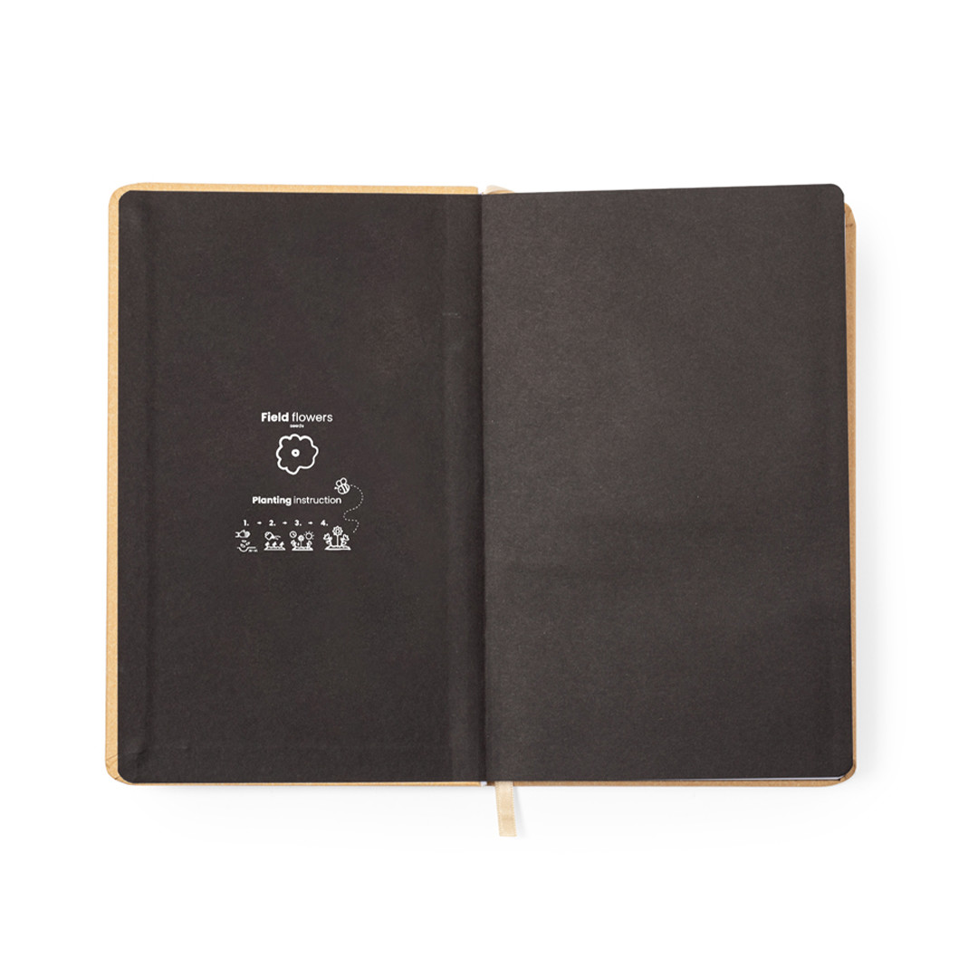 Bloco de notas de sementes fabricado em resistente cartão reciclado. Com capas rígidas, marca páginas e 80 folhas interiores pautadas em papel reciclado. Além disso, na capa contém uma cápsula com sementes de flores silvestres, em cores sortidas e com instruções de plantação na traseira da capa.O cartão reciclado provém da reutilização de excedentes de fabrico e reciclagem de papel no final da sua vida útil, tornando-se uma tela ecológica e sustentável. Capa Rígida. 80 Folhas. Flores silvestres