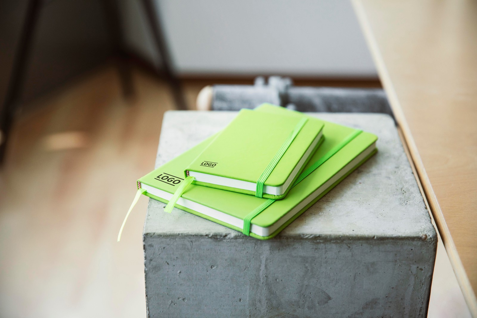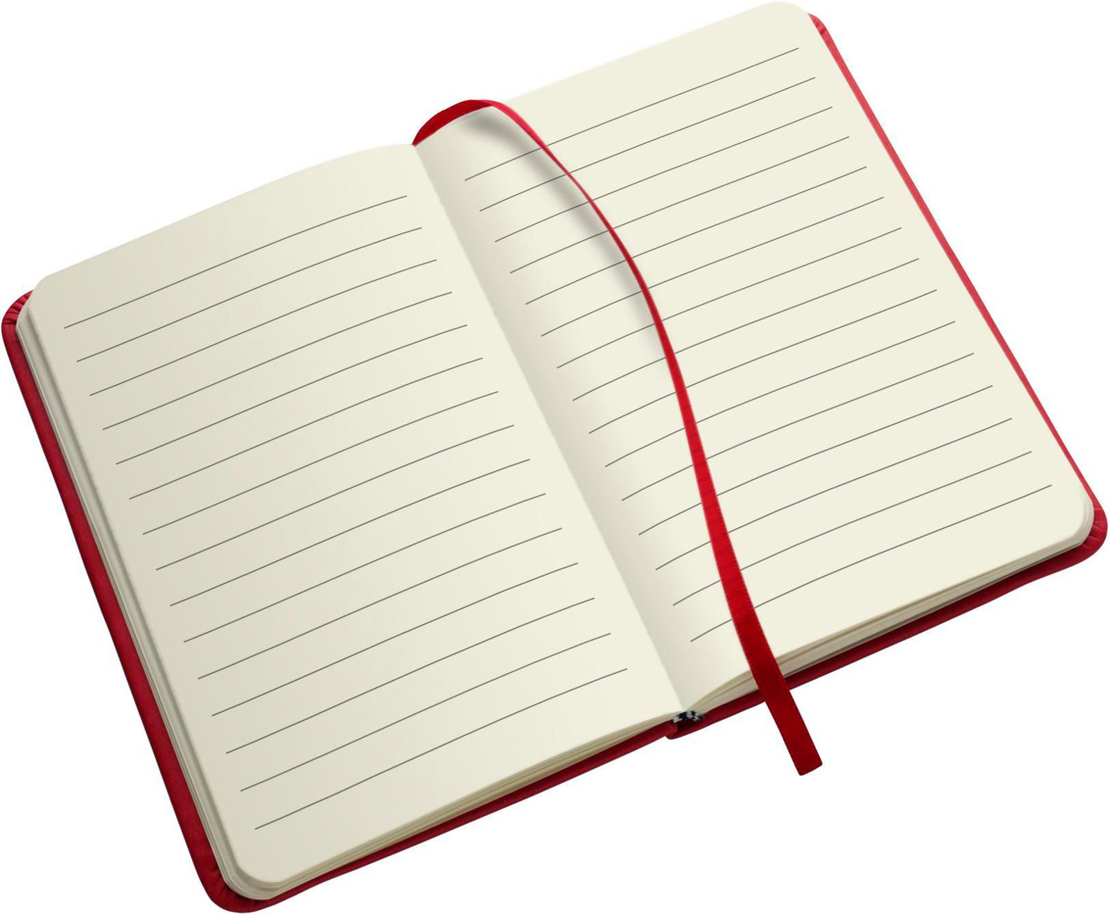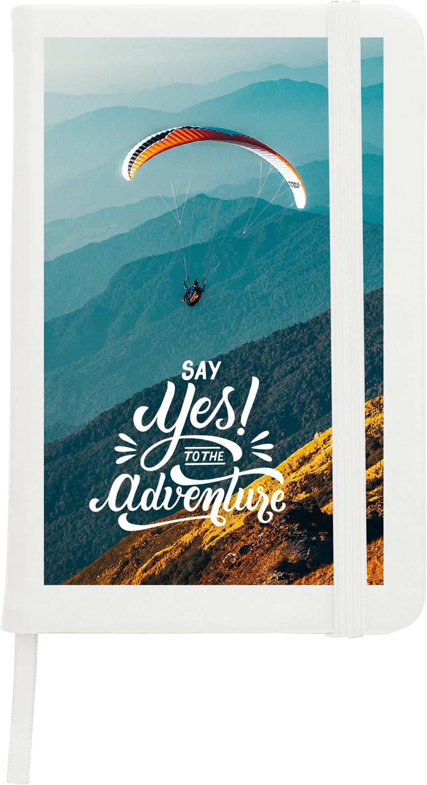 Bloco de notas A6 com 96 páginas pautadas, capa de PU com marcador e fecho de borracha.