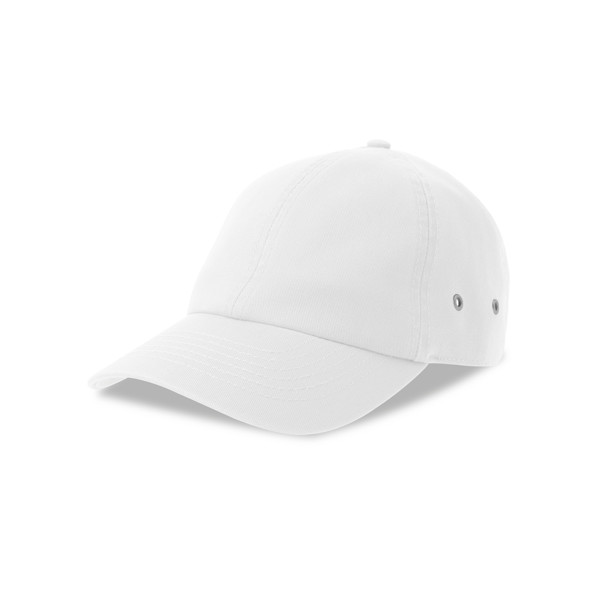 Boné de baseball não estruturado com um toque suave, em algodão. 6 painéis e 6 costuras na pala, visor curvo, ilhós metálicos laterais e fecho metálico atrás. 280gsm, 80% algodão orgânico, 20% algodão reciclado.