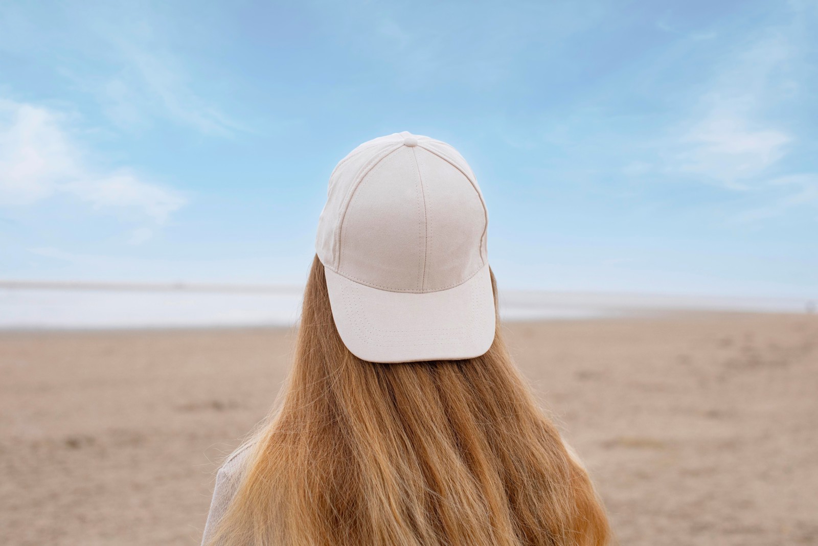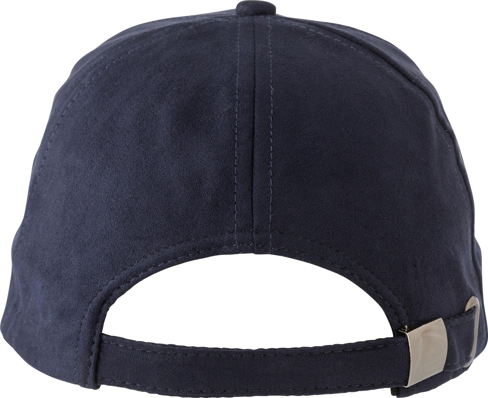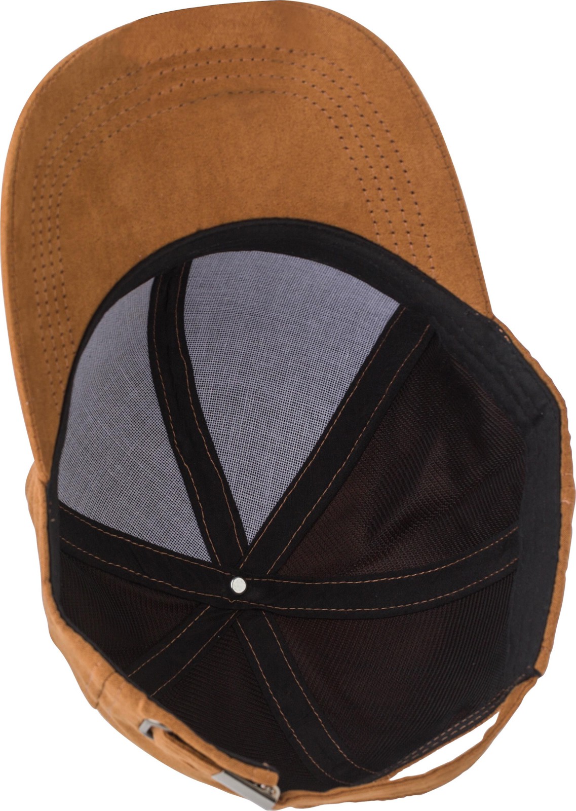 Boné de camurça com seis painéis e fecho de fivela em metal. Furos na parte superior do painel central.