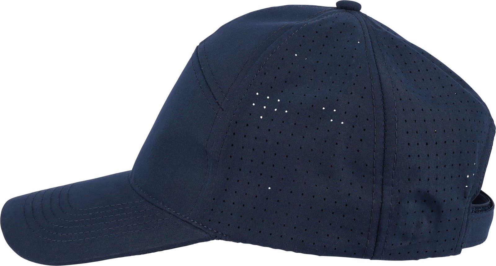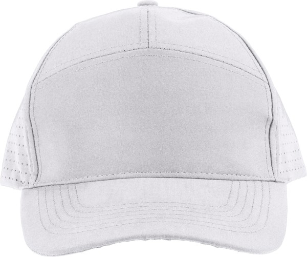 Boné em poliéster com orifícios de ventilação cortados a laser nos painéis traseiros. Apresenta um desenho de 7 painéis com um painel à frente e uma pala de 7 cm. Ajustável e respirável, sem etiqueta PU.