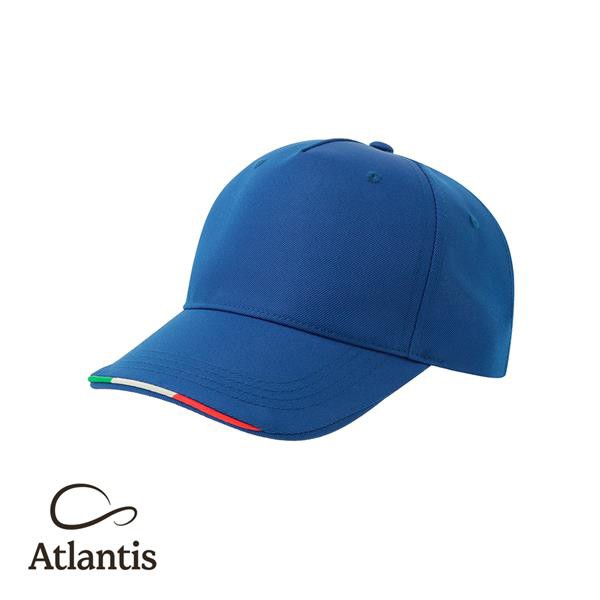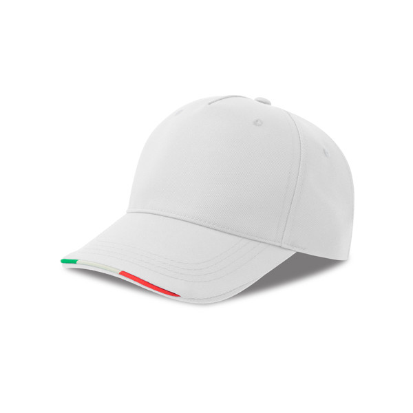 Boné clássico de basebol, em poliéster reciclado. Com 5 painéis, visor curvo, pala com detalhe da bandeira italiana, fecho em velcro, 4 ilhoses. 220gsm 100% poliéster reciclado.
