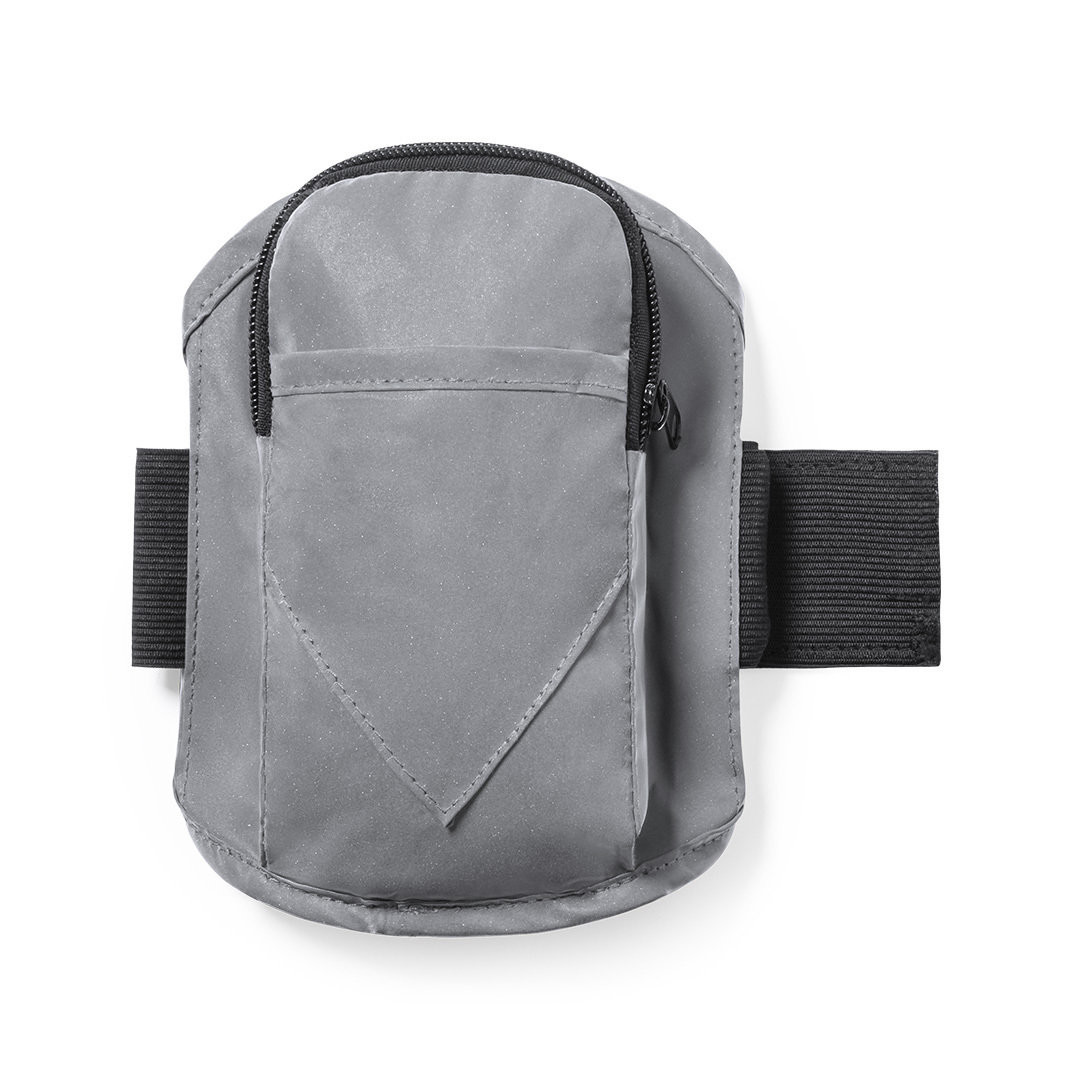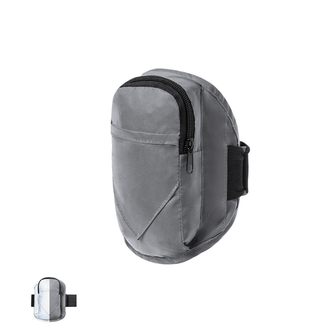 Bracelete desportiva em poliéster 210T, fabricada utilizando tecido com grande capacidade para refletir intensamente a luz, graças a milhões de pigmentos refletores e baseando-se no princípio da retro-reflexão da luz, uma propriedade de visibilidade nocturna que consiste na refração da luz desde a fonte de origem da mesma. Bolso principal com fecho de correr e bolso frontal com fecho de velcro. Com tira elástica ajustável e resistente à água. Refletora
