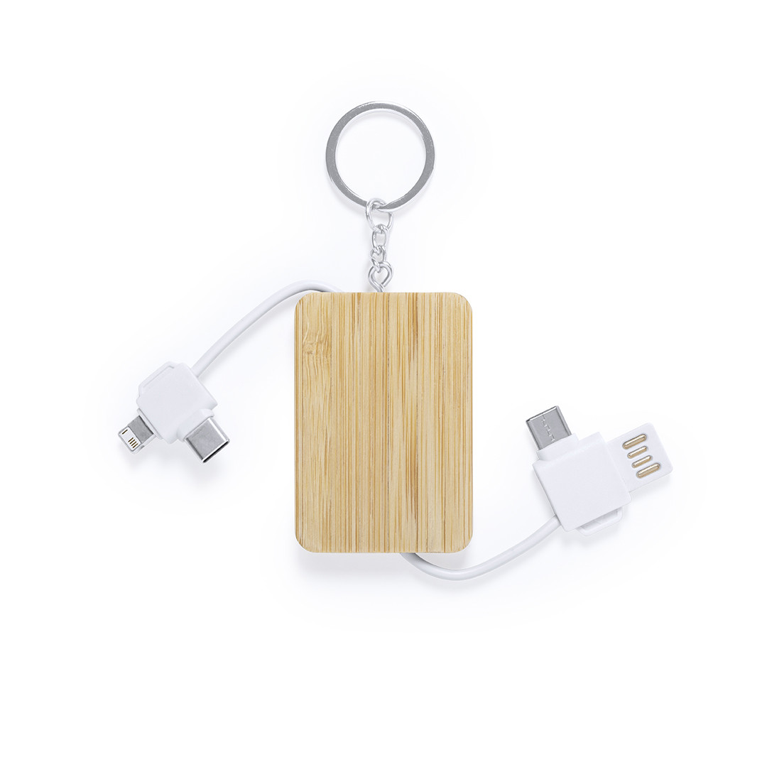 Carregador porta-chaves de linha nature e design compacto. Feito em bambú a partir de cortes naturais. Conexões Tipo C (entrada e saída) e dual micro USB-Lightning, com sistema USB reversível que facilita a conexão à fonte de alimentação. Ampla superfície de impressão. Apresentado em bolsa individual auto-vedante de design eco. Conexão Micro USB, Tipo C e Lightning 5V DC 2.0A