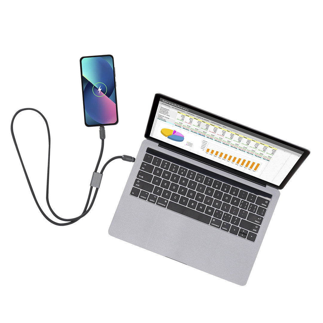 Pulseira cabo de carregamento, função de transferência de dados e suporte para telemóvel. Com entrada/saída Tipo C e capacidade de 60W, permitindo carregamento rápido. Funcionalidade e comodidade num único acessório. Adequado para transferência de dados. Conexão Tipo C PD 60W