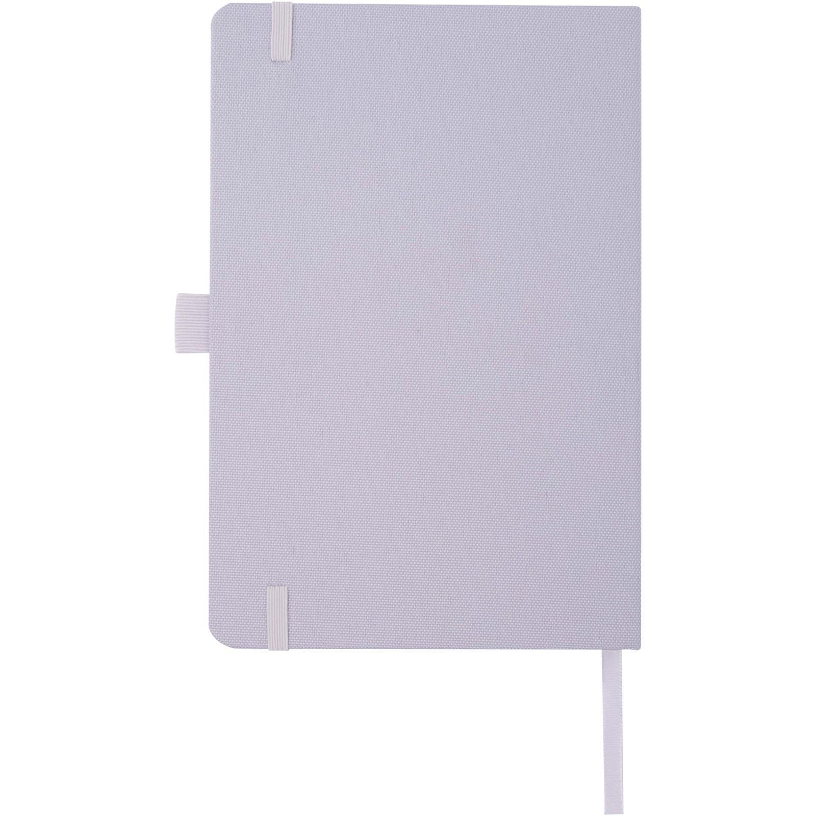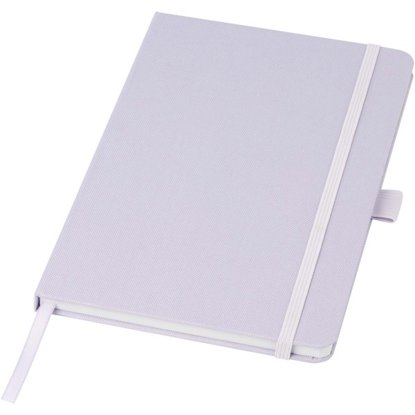 Caderno A5 com capa feita em tecido RPET. Possui 80 folhas de 70 g/m² de papel reciclado pautado, uma alça para caneta e marcador de fita.