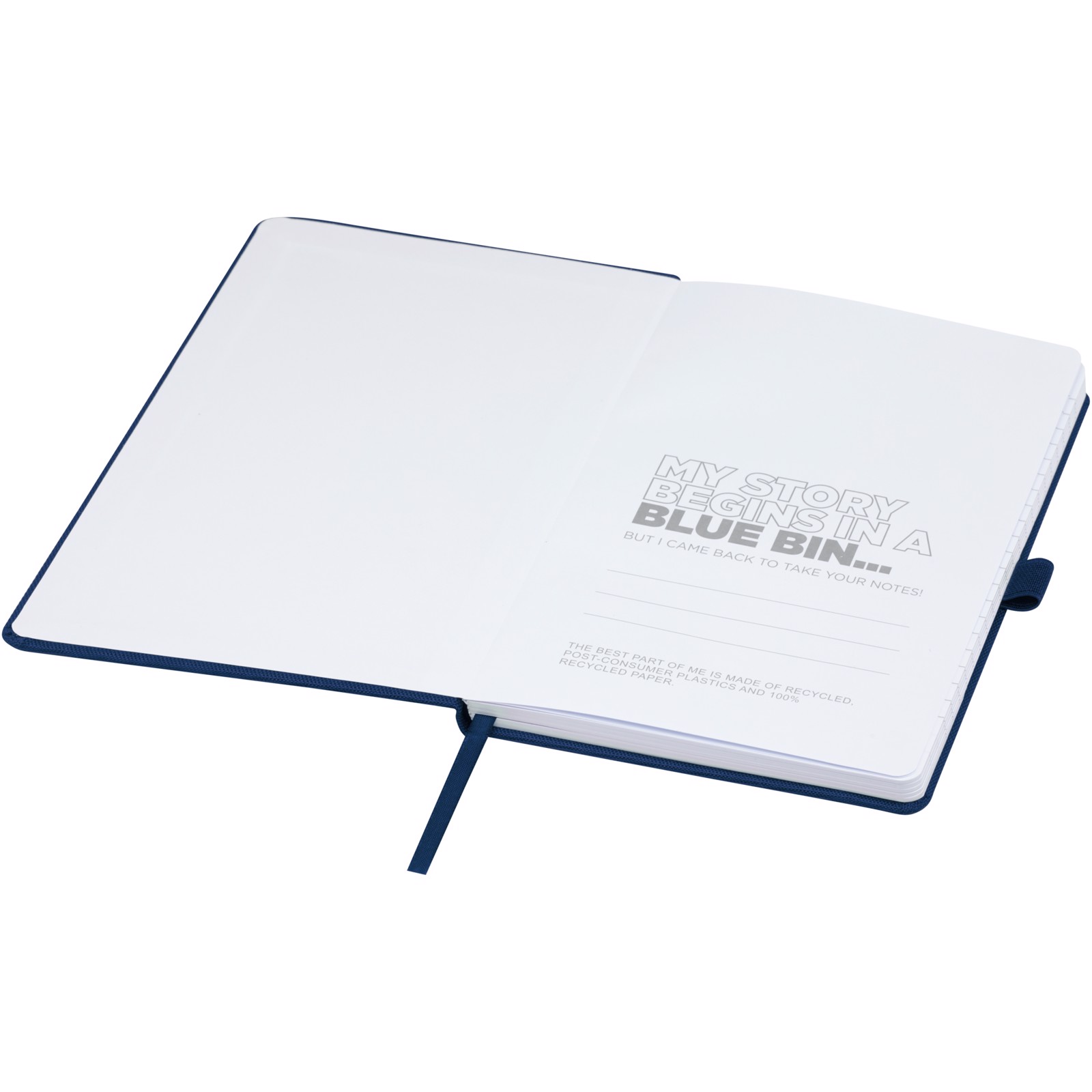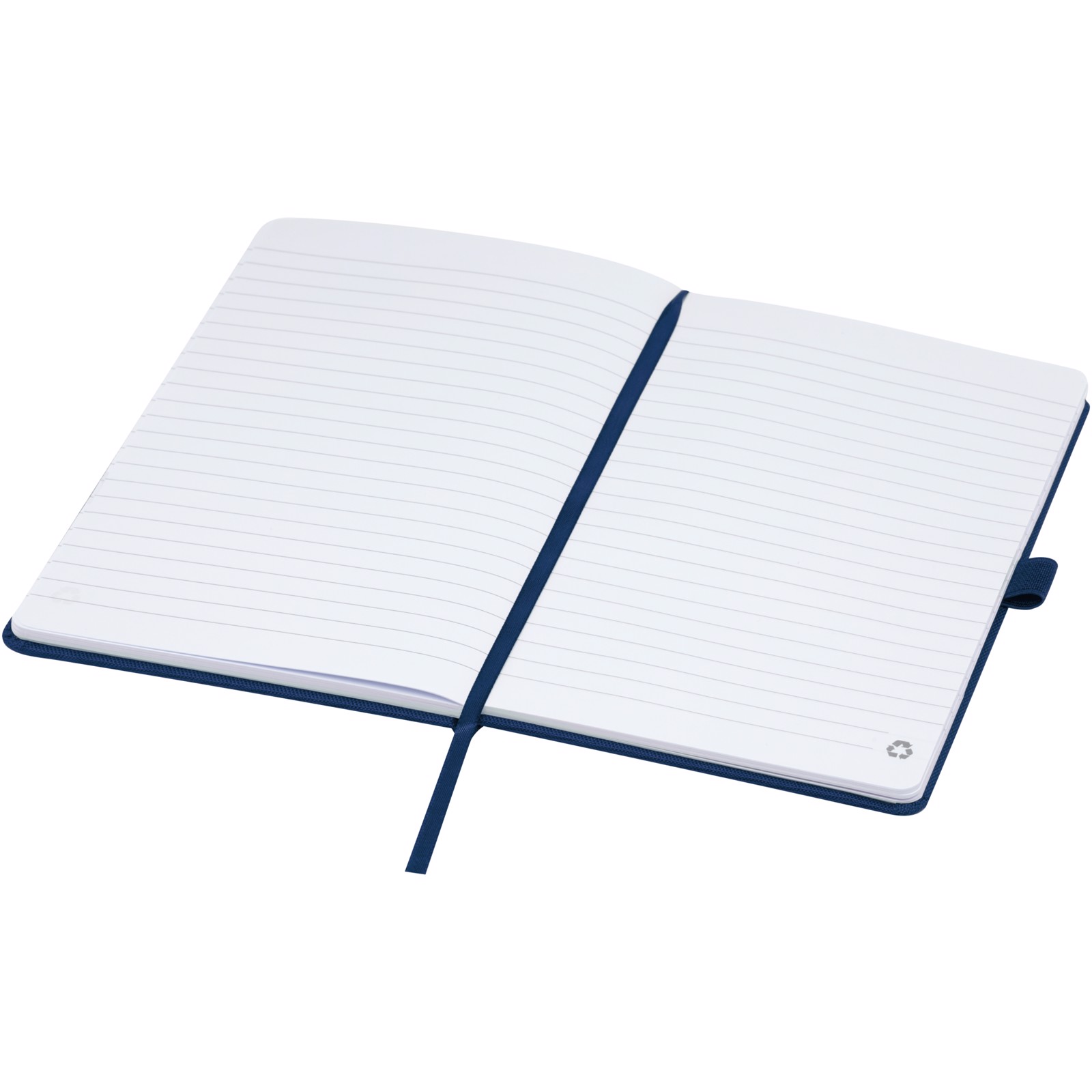 Caderno A5 com capa feita em tecido RPET. Possui 80 folhas de 70 g/m² de papel reciclado pautado, uma alça para caneta e marcador de fita.