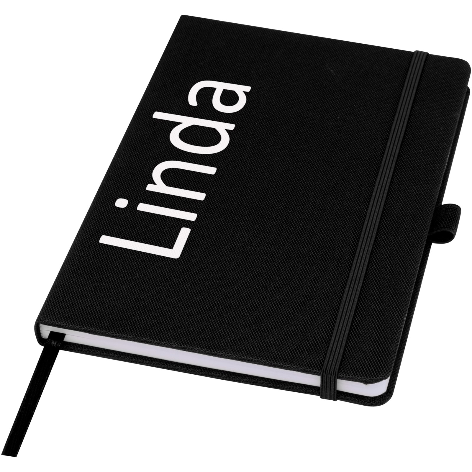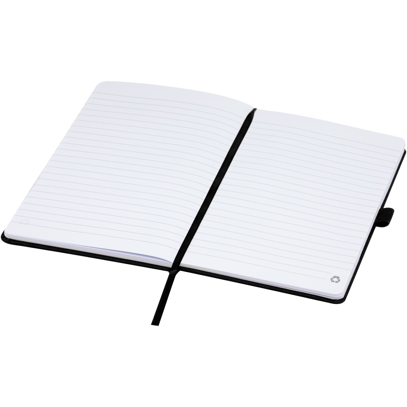 Caderno A5 com capa feita em tecido RPET. Possui 80 folhas de 70 g/m² de papel reciclado pautado, uma alça para caneta e marcador de fita.