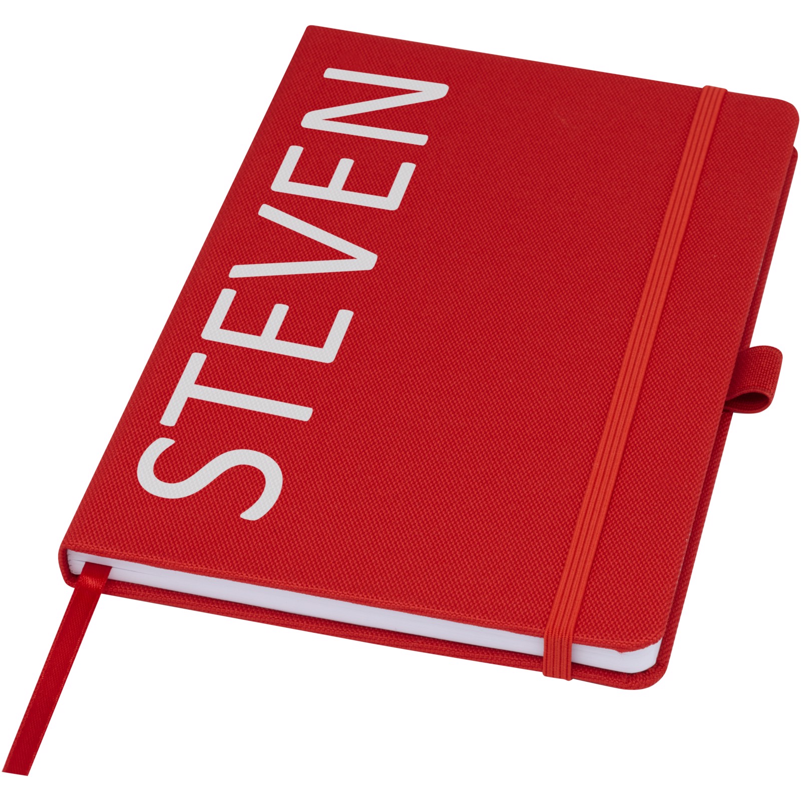 Caderno A5 com capa feita em tecido RPET. Possui 80 folhas de 70 g/m² de papel reciclado pautado, uma alça para caneta e marcador de fita.