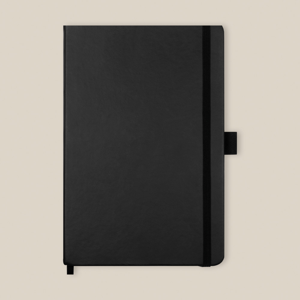 Bloco tamanho A5 com capa em PU de alta qualidade e 32 folhas pautadas, 32 folhas lisas, 32 quadradas e 32 pontilhadas, cor creme no interior. Inclui bolso na contracapa, marcador de páginas e suporte para telemóvel.