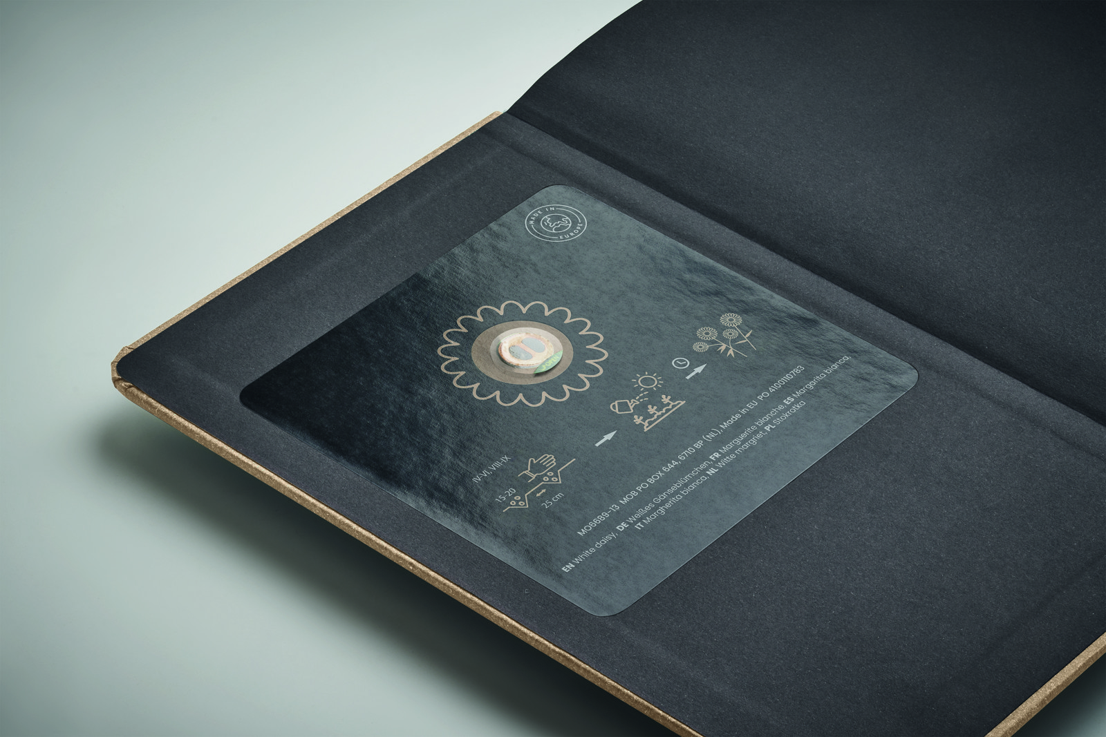 Caderno A5 com capa de papel duro colhido de forma sustentável. Encadernado. 184 páginas forradas (92 folhas) em papel reciclado. Marcador de página em algodão. Inclui sementes para sementeira. Fabricado na UE. Este caderno sustentável tem um baixo impacto ambiental e permite uma grande oferta promocional. Plante as sementes após o caderno estar todo preenchido e uma selecção de flores silvestres irá crescer.