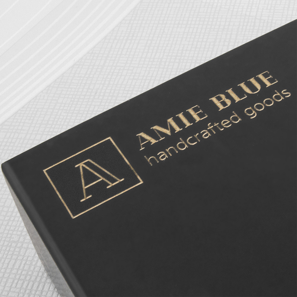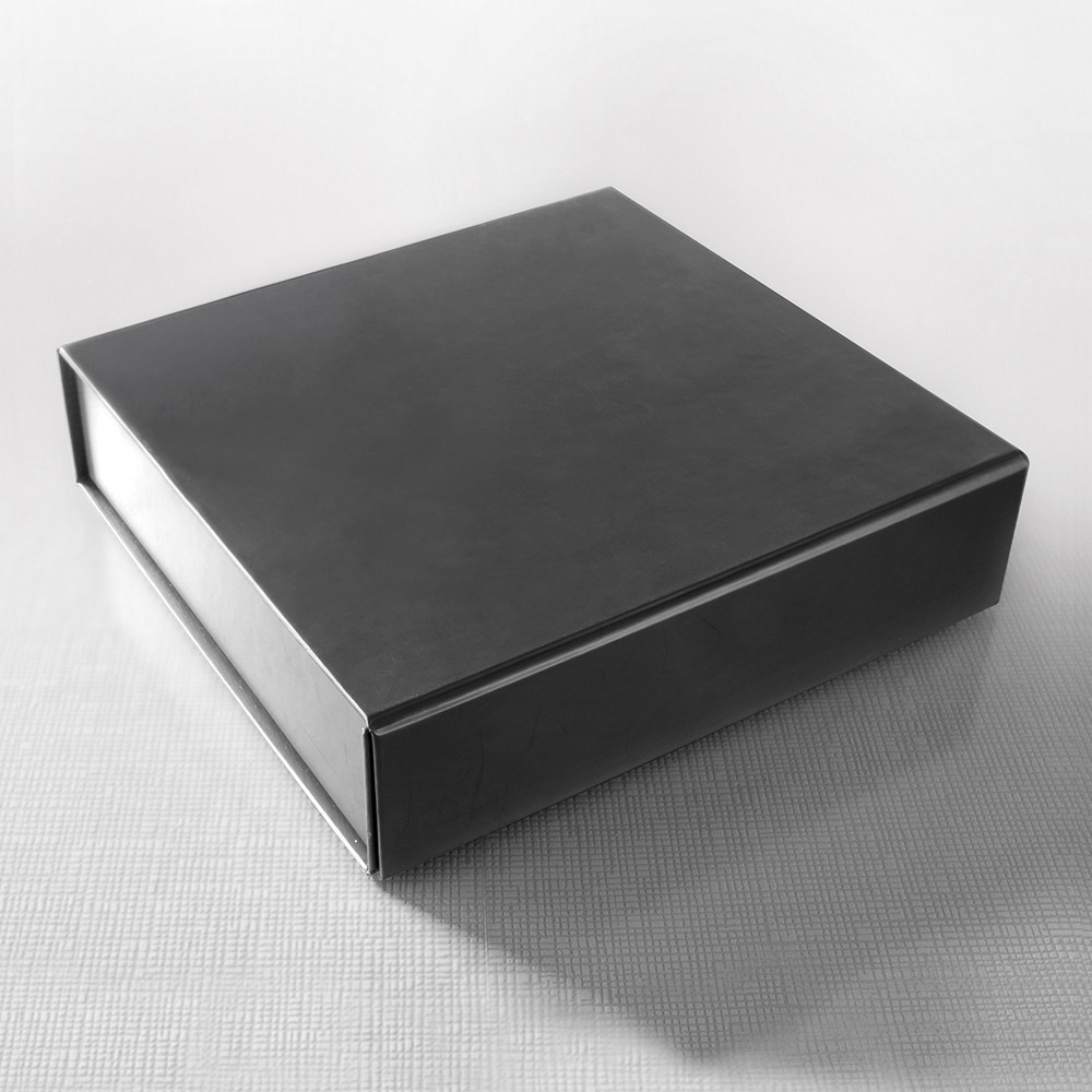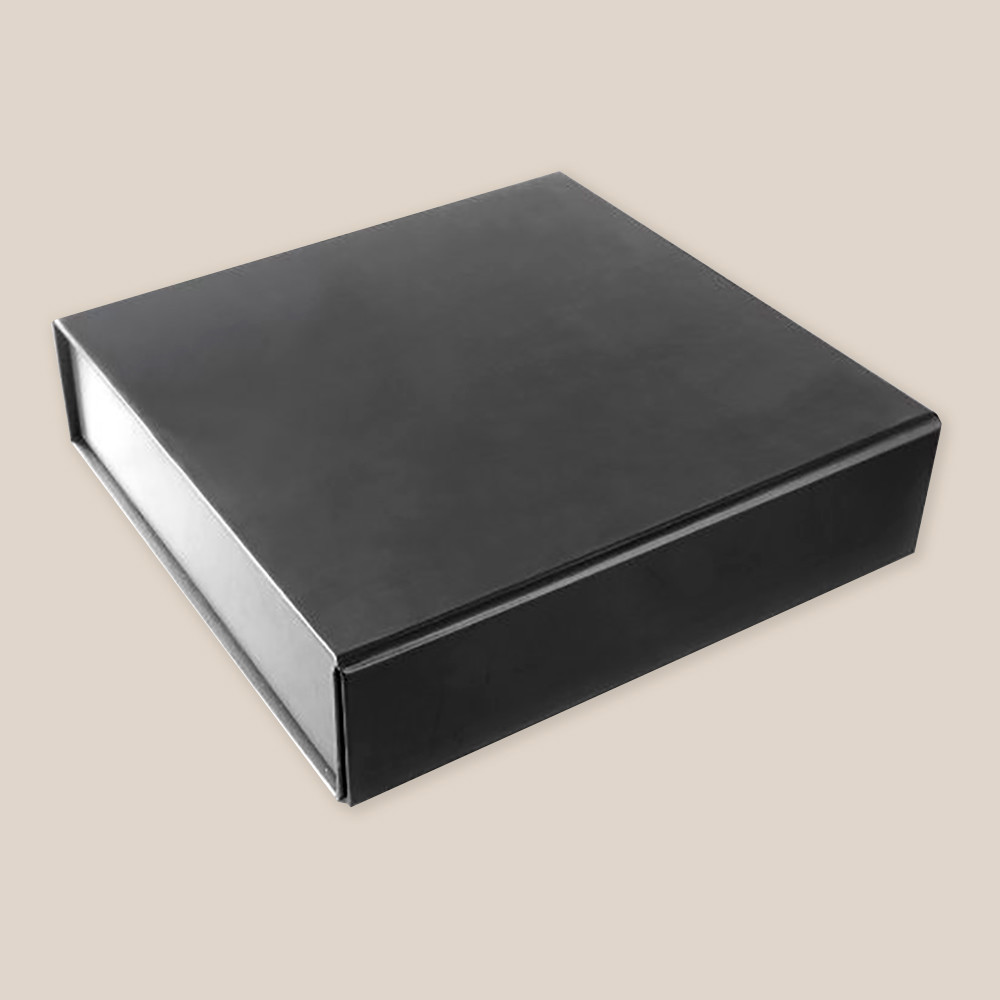 Caixa dobrável de cartão forrado de grande qualidade com fecho magnético.