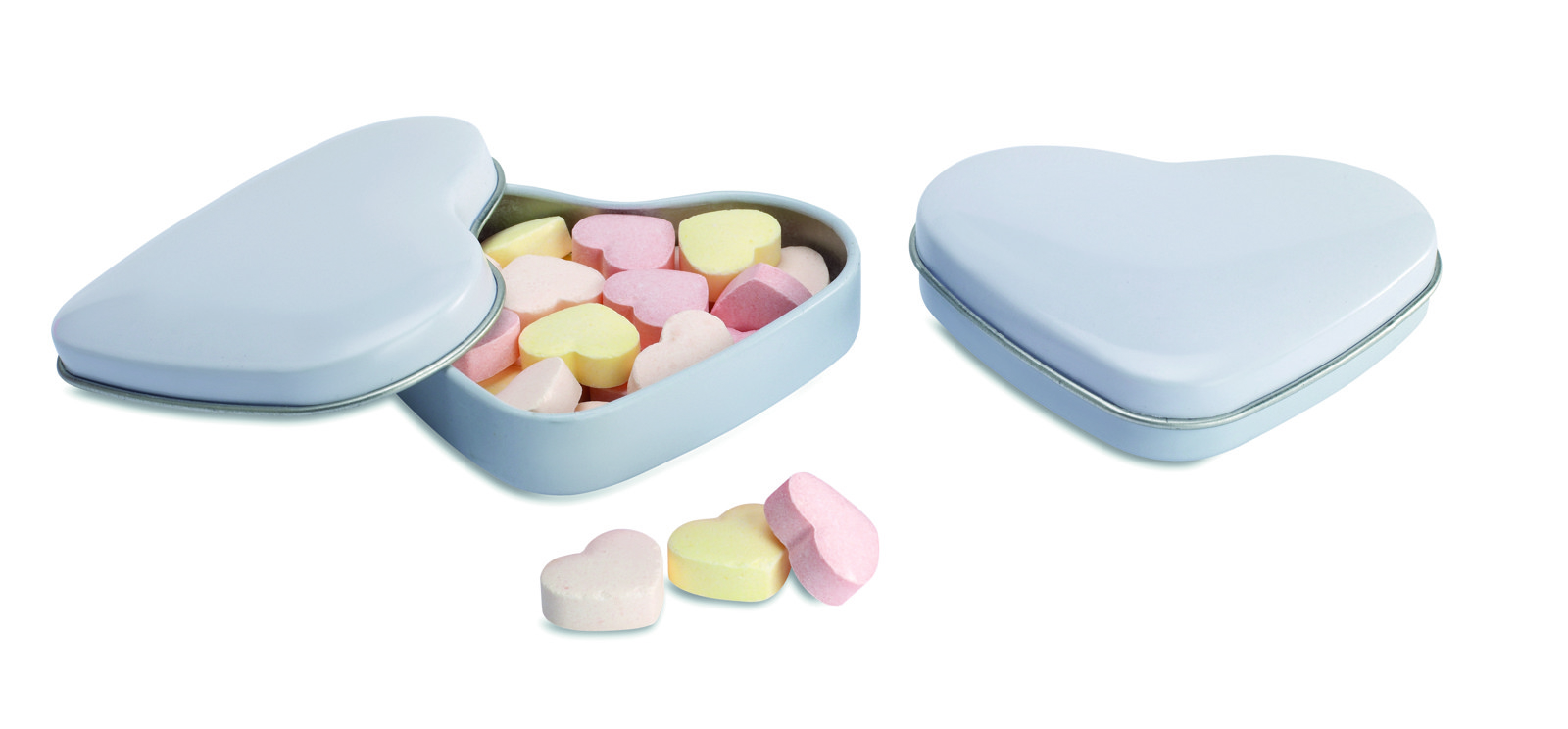Caixa de alumínio em forma de coração. Contém 24 gr de rebuçados em forma de coração.