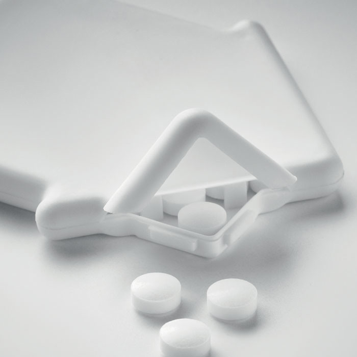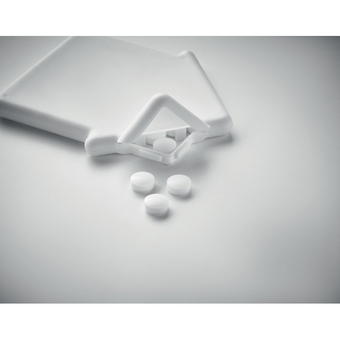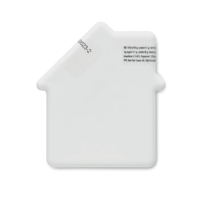 Caixa de caramelos com forma de casa. 8 gramas de caramelos de menta incluídos.