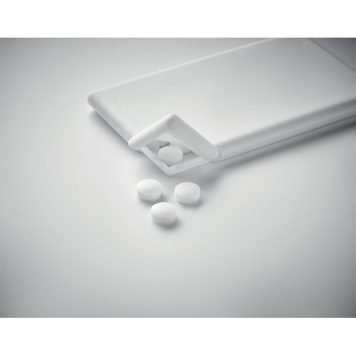 Caixa de caramelos em forma de cartão de crédito. 8 gramas de caramelos de menta incluídas.