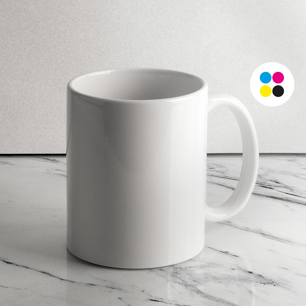 Caneca fabricada em cerâmica com 350 ml de capacidade, de cor branco com acabado especial para sublimação.
