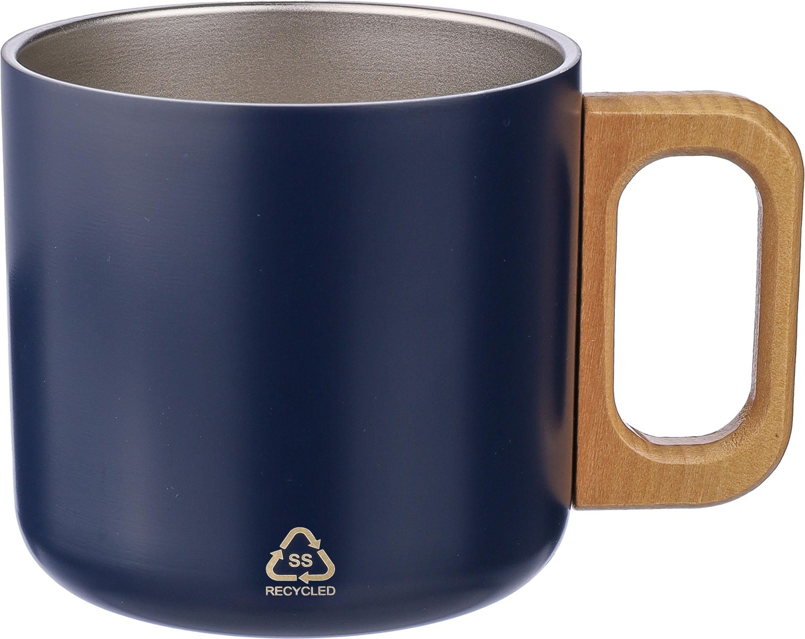 Caneca de parede dupla em aço inoxidável reciclado (400 ml) com pega em madeira. Não pode ser lavada na máquina de lavar loiça. Inclui um logótipo gravado em aço inoxidável reciclado. Apresentada individualmente numa caixa de cartão castanha.