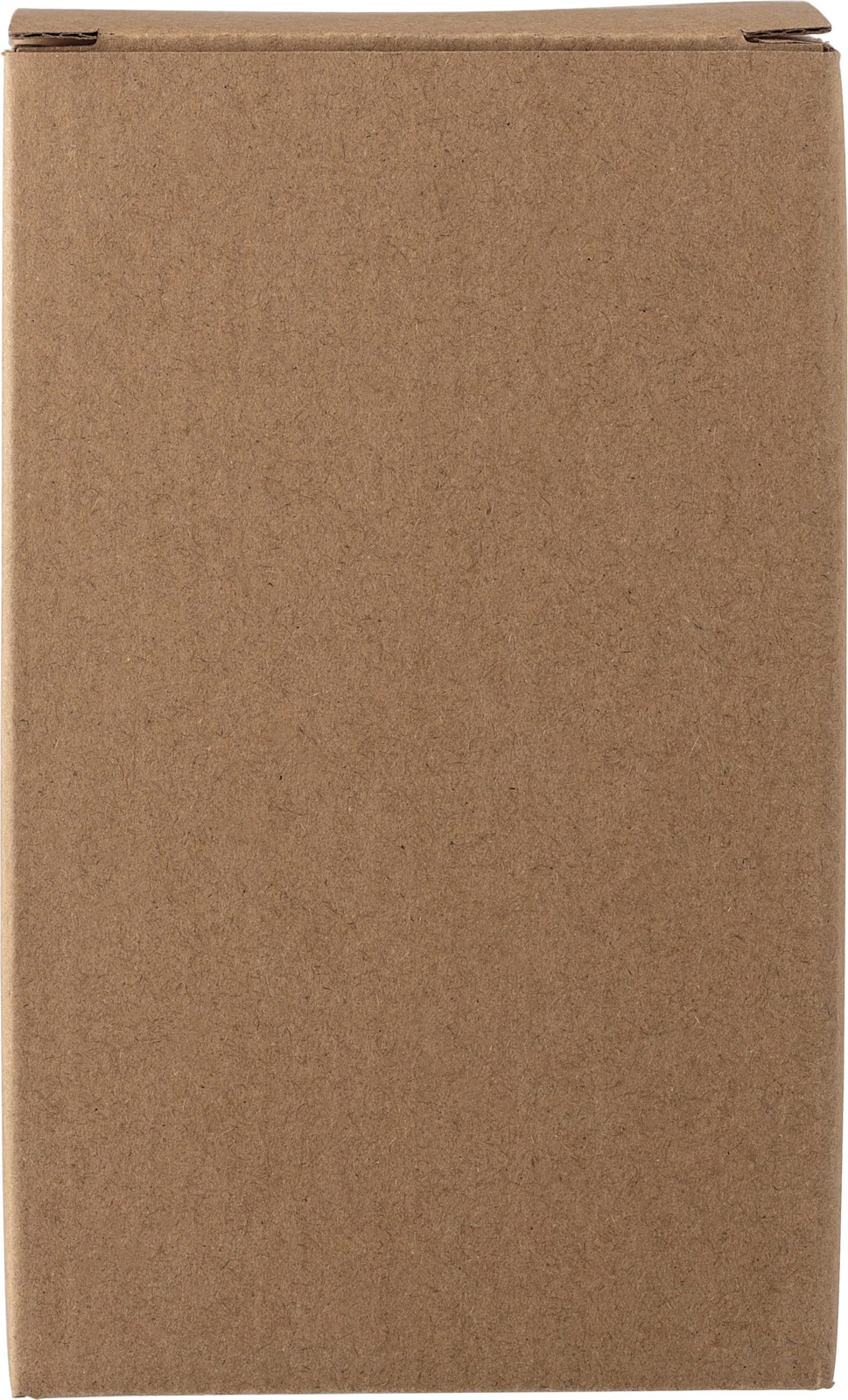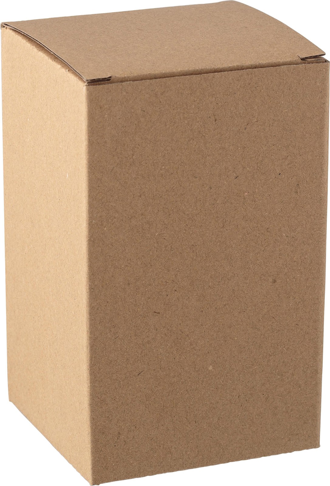 Copo em aço inoxidável e tampa em PP (350 ml). A tampa tem um anel de silicone com fecho dobrável na parte superior. Apresentado numa caixa de cartão castanha.