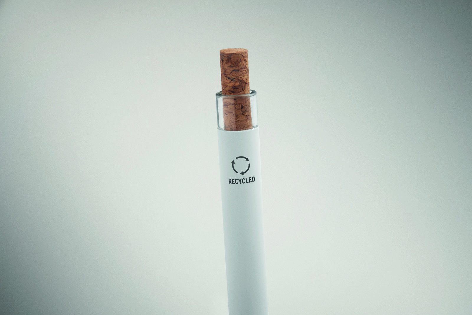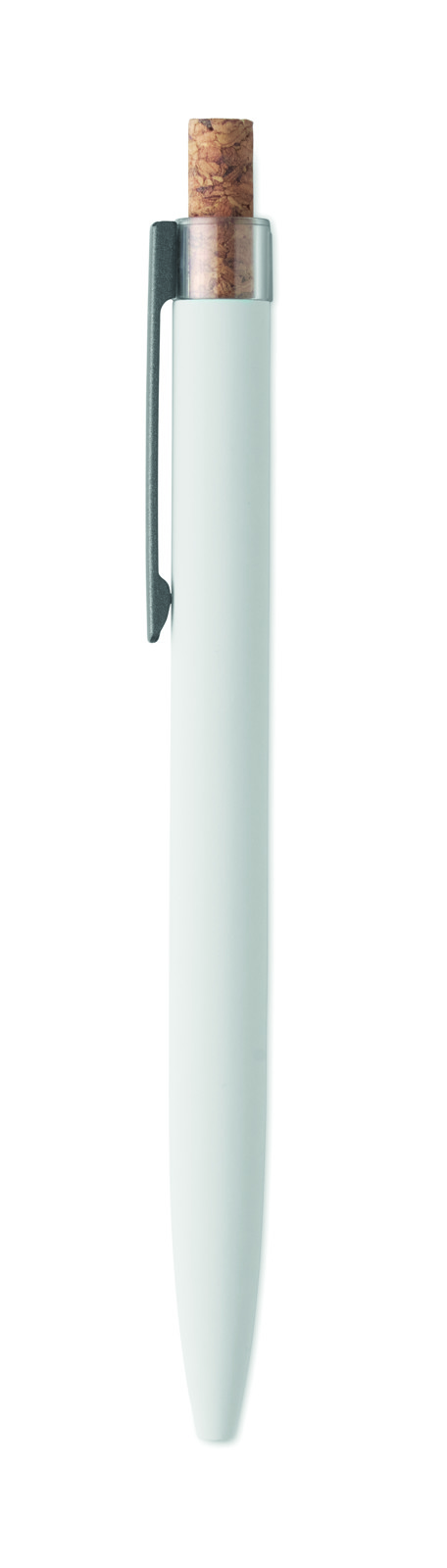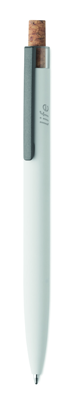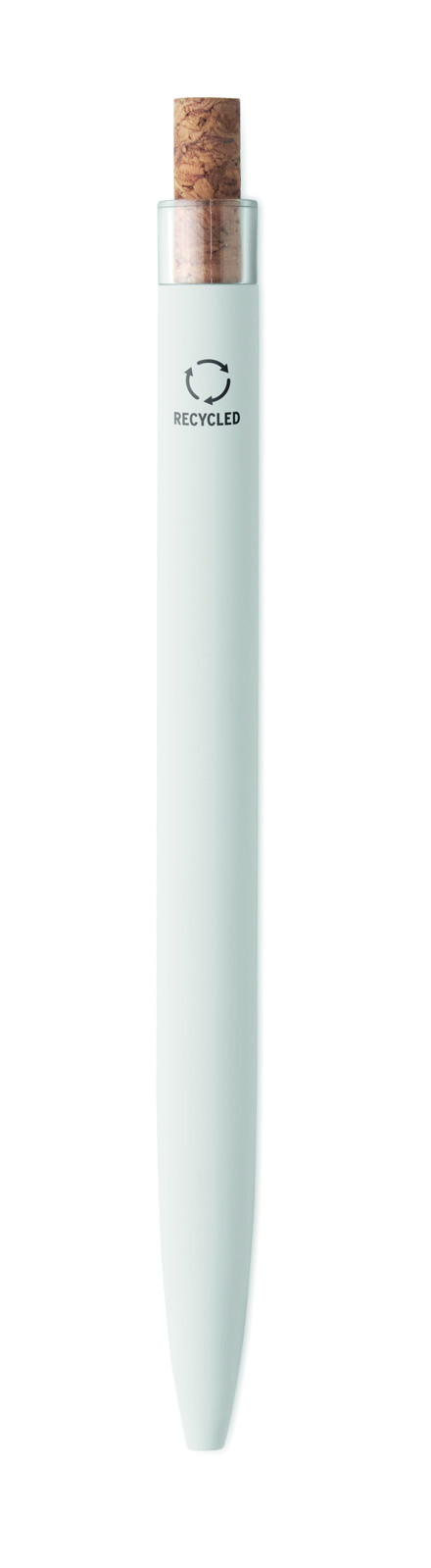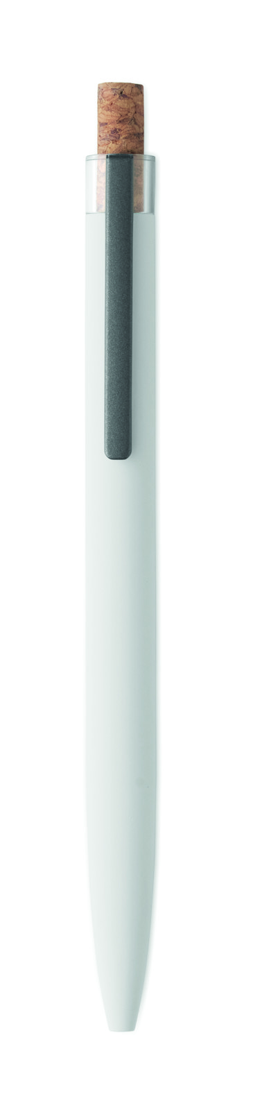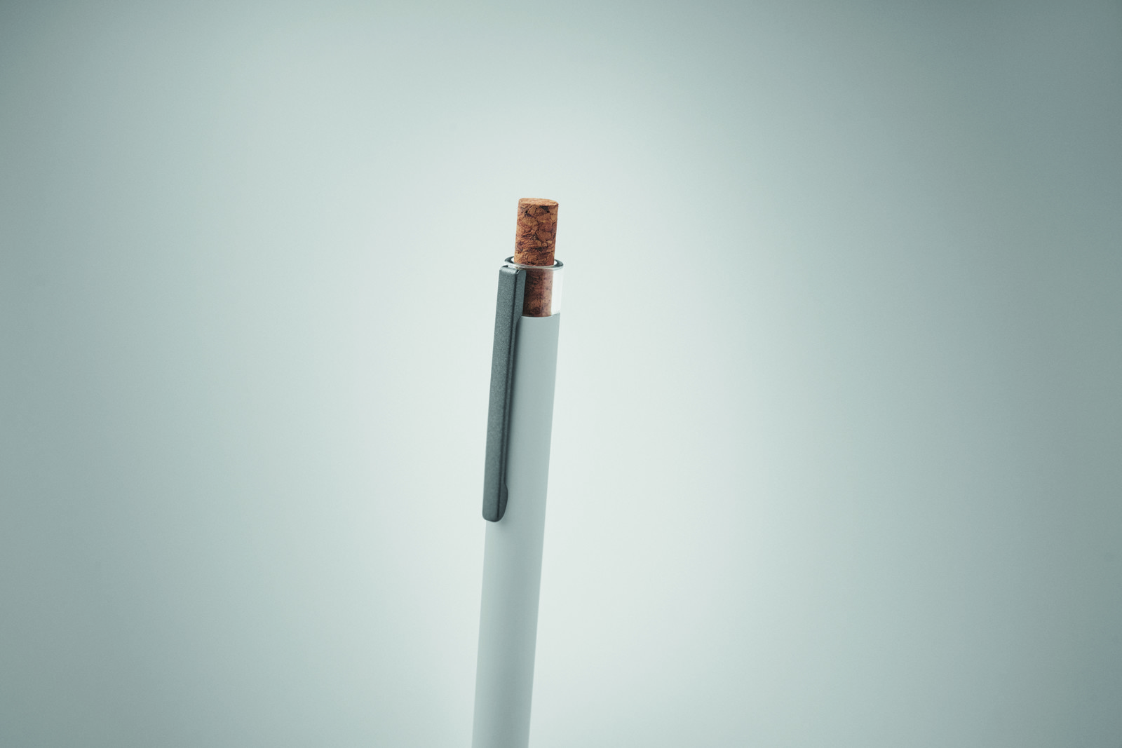 Caneta esferográfica de pressão em alumínio reciclado com botão de cortiça e clip de metal. Tinta azul.