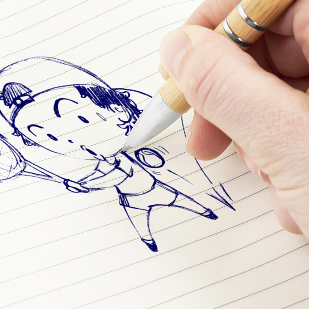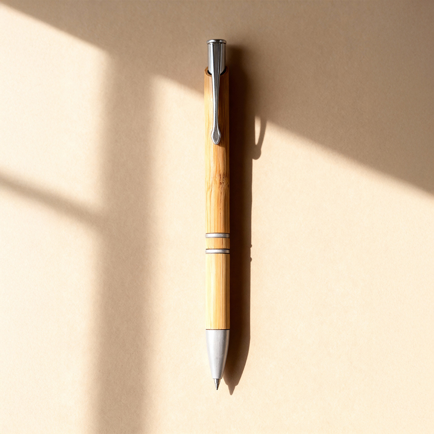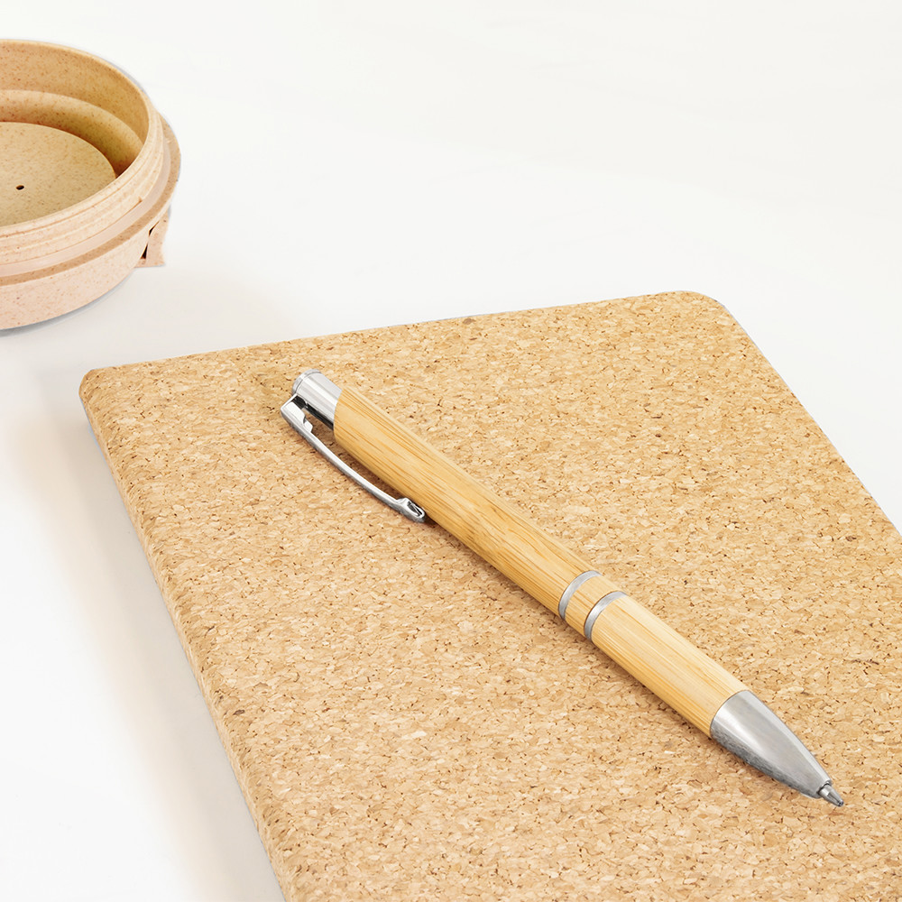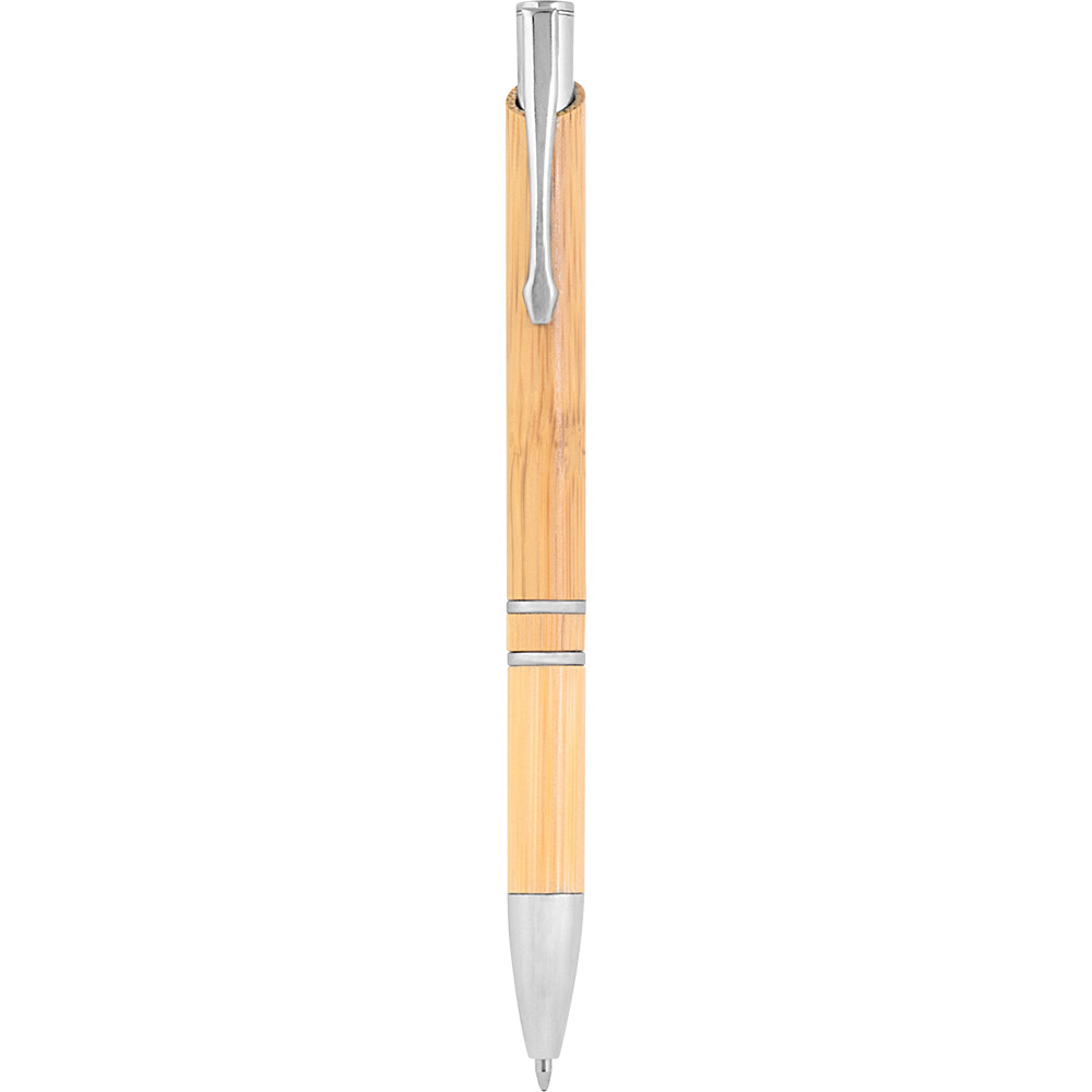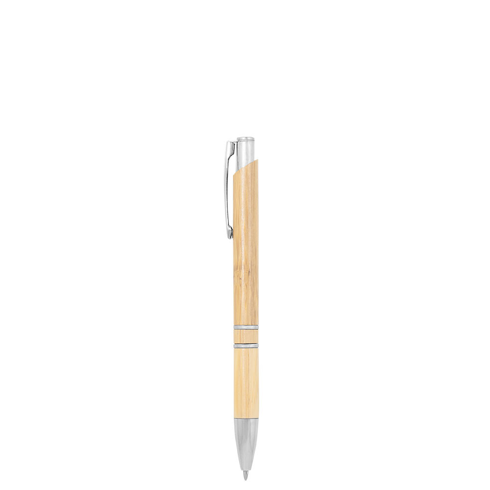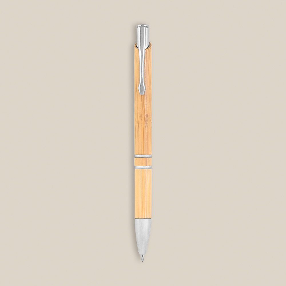 Esferográfica com corpo de bambu e clip fabricado em alumínio.