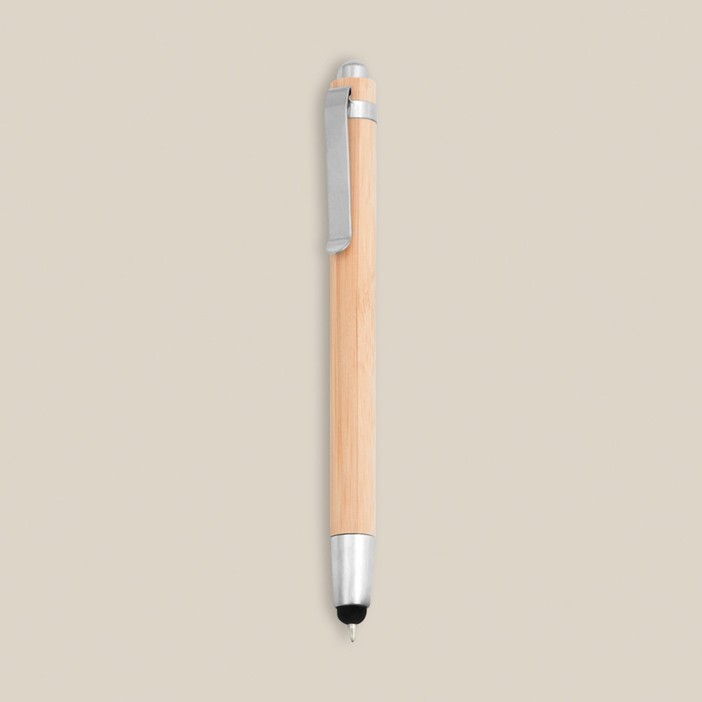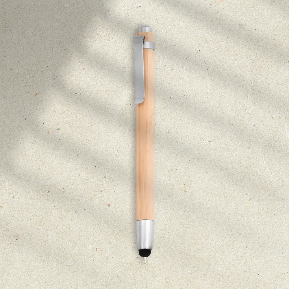 Esferográfica fabricada em bambú e metal para os mais ecológicos. Dispõe de um ponteiro para dispositivos tácteis.