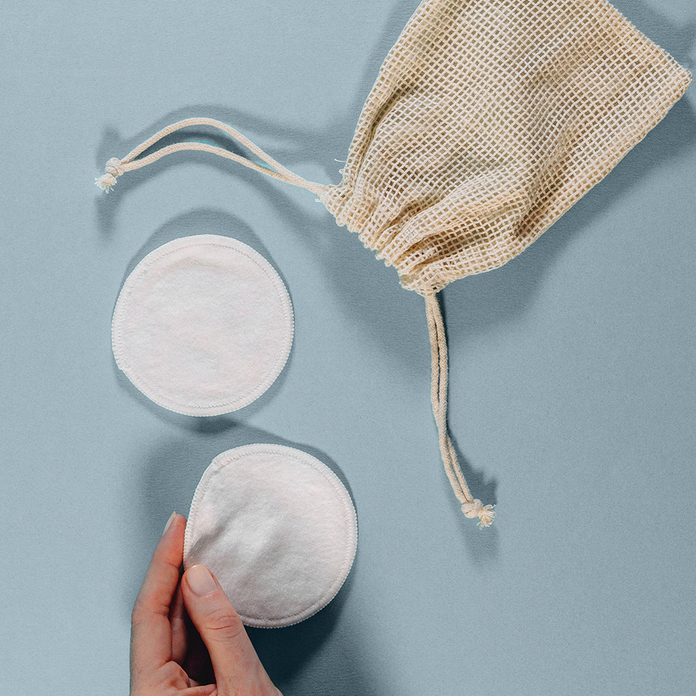 Conjunto de dois discos desmaquilhantes reutilizáveis, apresentado em saco de algodão.