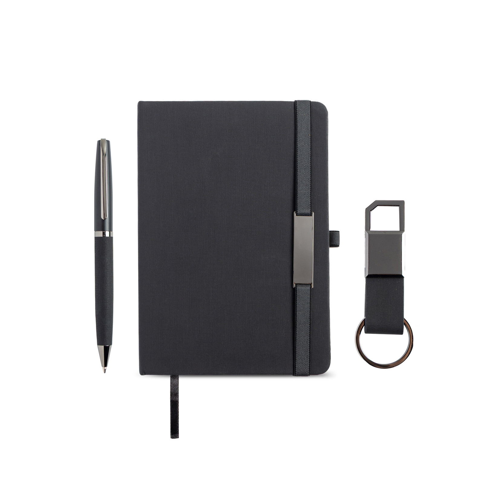 Conjunto elegante composto por três elementos harmoniosamente combinados. Inclui um bloco A5 com capa rígida revestida em tecido PU, elástico com detalhe metálico espelhado e fitilho a condizer. Com 160 páginas pautadas, é ideal para anotações, esboços ou registos do dia a dia. A acompanhar, uma esferográfica em metal preto espelhado com corpo em PU, que oferece uma escrita fluída na cor preta. O conjunto integra ainda um porta-chaves em PU com anilha metálica preta espelhada. Todos os artigos são apresentados numa sofisticada caixa de oferta preta, envolta por uma manga branca, tornando este conjunto uma escolha distinta para brindes corporativos, ocasiões especiais ou presentes memoráveis.