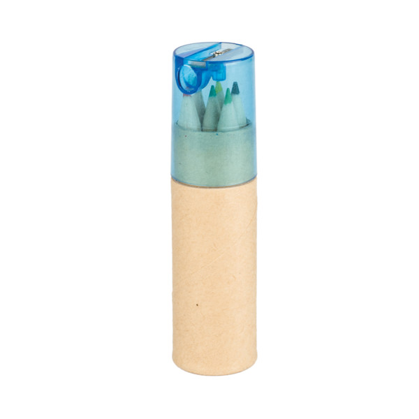 Conjunto de lápis de cor com seis cores diferentes, acondicionados num tubo de cartão com afiador de plástico incorporado na tampa.