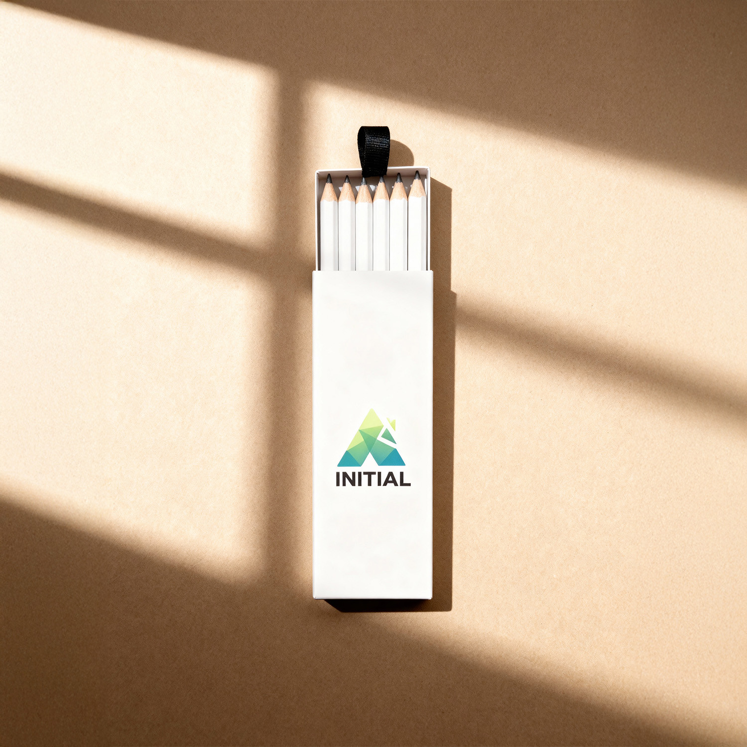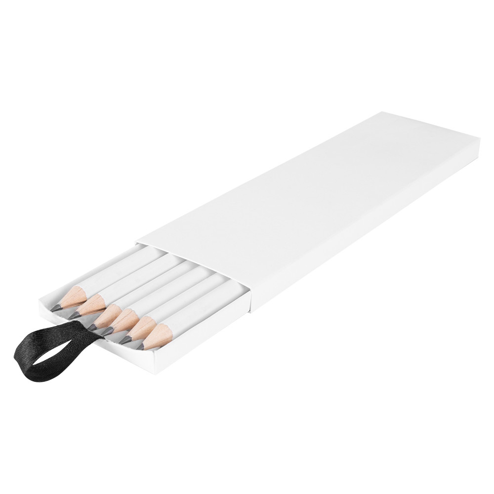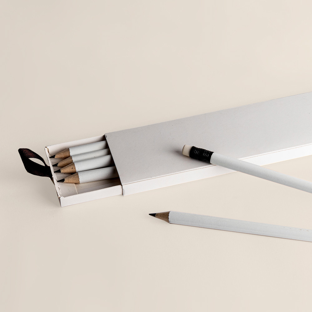 Set de 6 lápis de cor branca apresentados numa caixinha de cartão branca.
