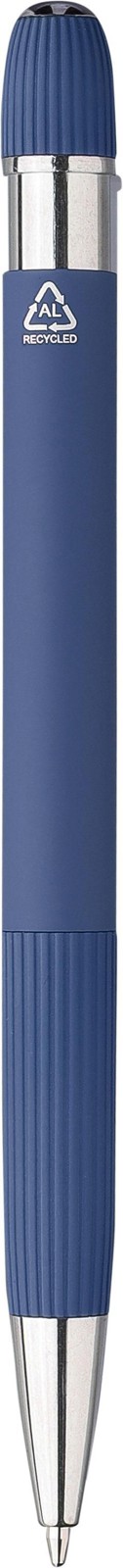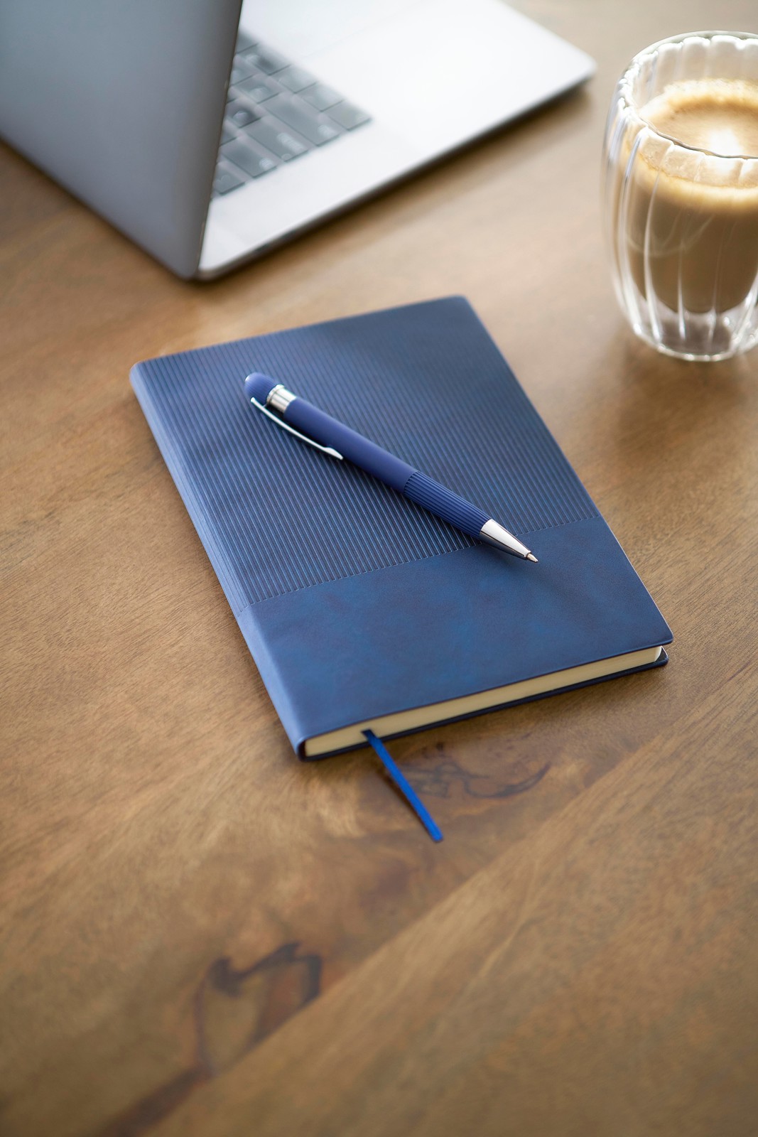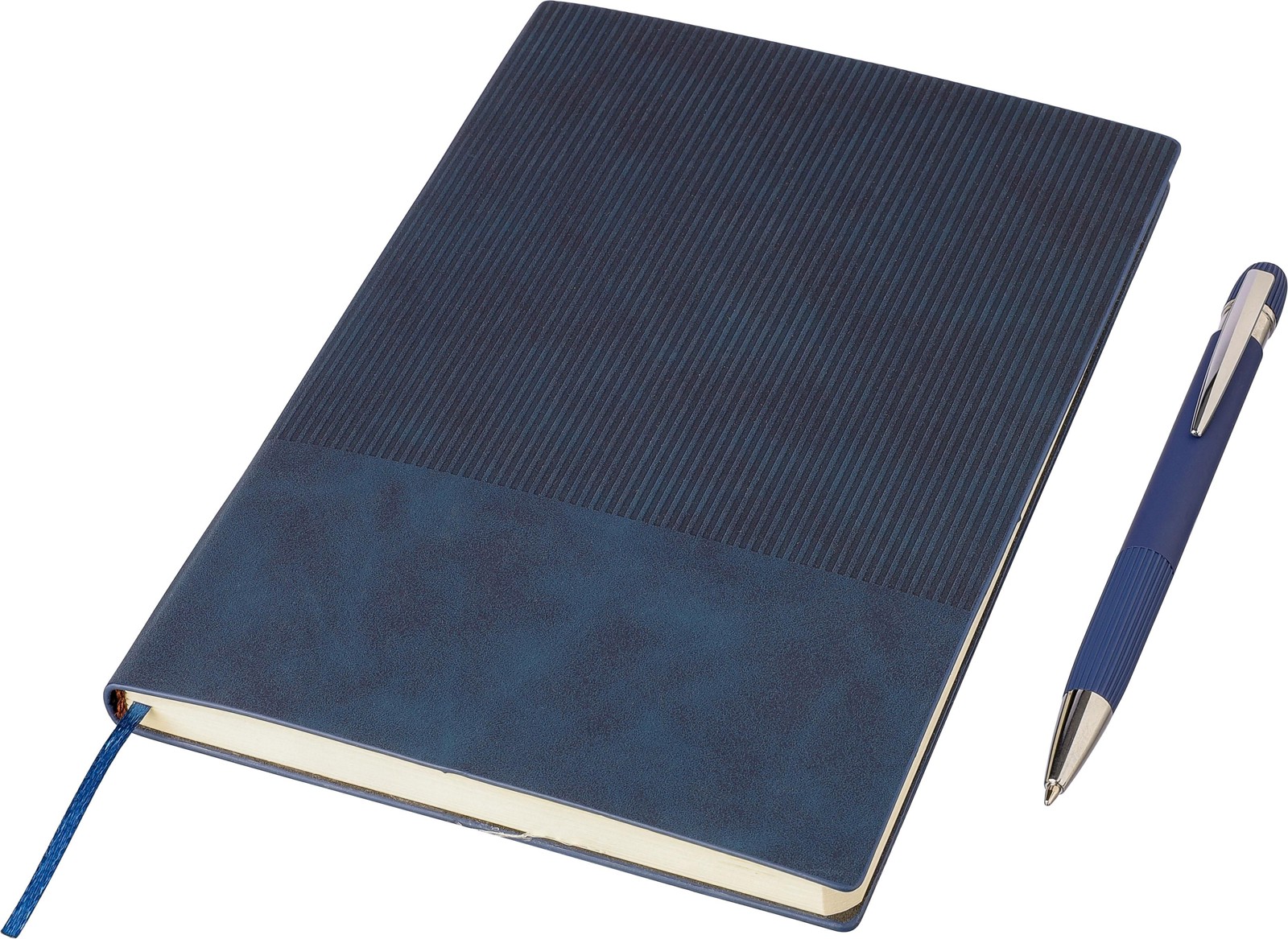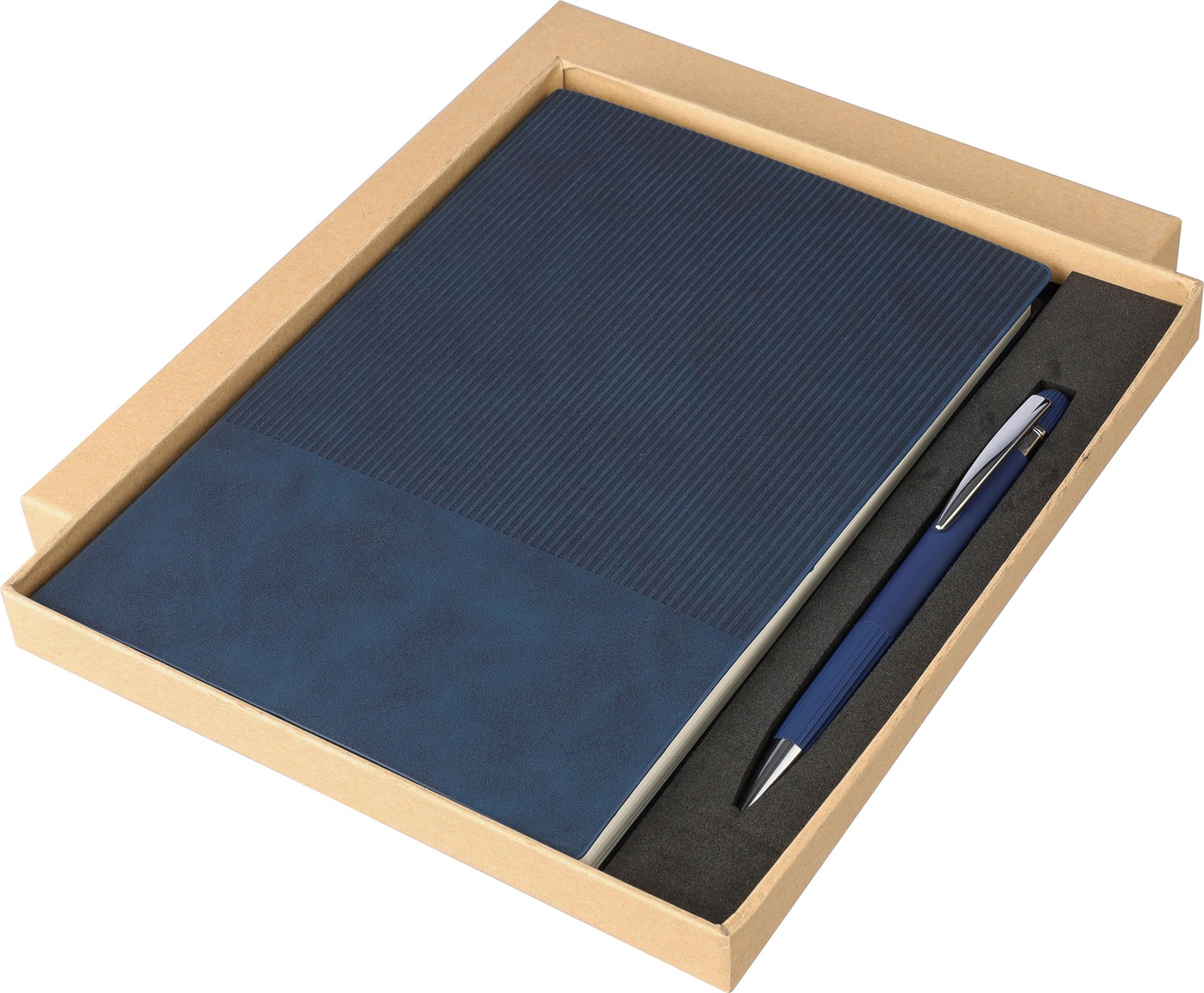 Conjunto de bloco de notas (A5) e esferográfica em PU reciclado composto por um bloco de notas com 100 folhas pautadas em papel de 80 g/m² e uma esferográfica em alumínio reciclado com acabamento emborrachado. O bloco de notas tem um marcador de fita e uma capa com aspeto de veludo cotelê na parte superior da frente e no verso, com um logótipo reciclado em relevo no verso. A esferográfica inclui uma pega às riscas e detalhes na parte superior, uma ponta de plástico cromado, um botão de pressão, um clipe de metal e um logótipo reciclado gravado a laser. Embalada numa caixa de cartão castanha resistente com revestimento em EVA para a esferográfica. Tinta azul.