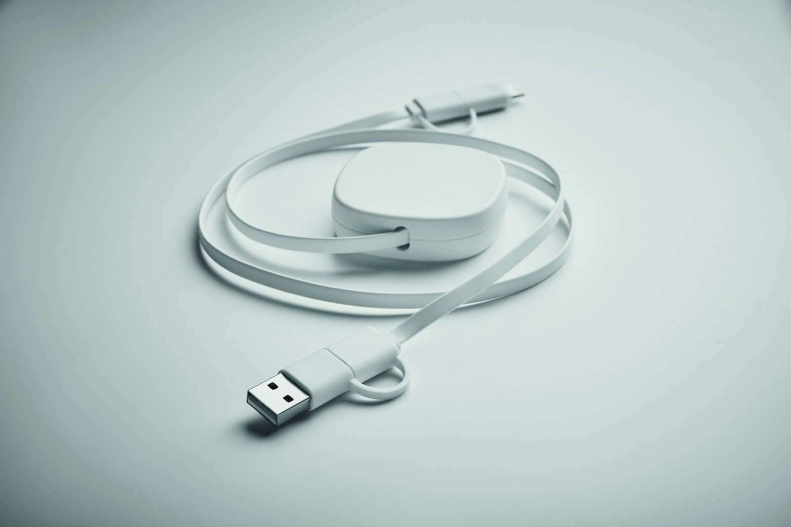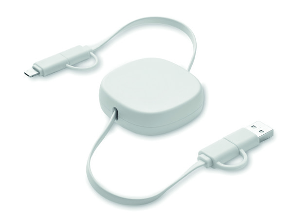 Cabo de carregamento retrátil de 60W. Caixa em ABS reciclado. Entrada: 2 em 1 Tipo C e Tipo A. Saída: Tipo C e micro-B (ficha 2 em 1). Comprimento do cabo: 80 cm.