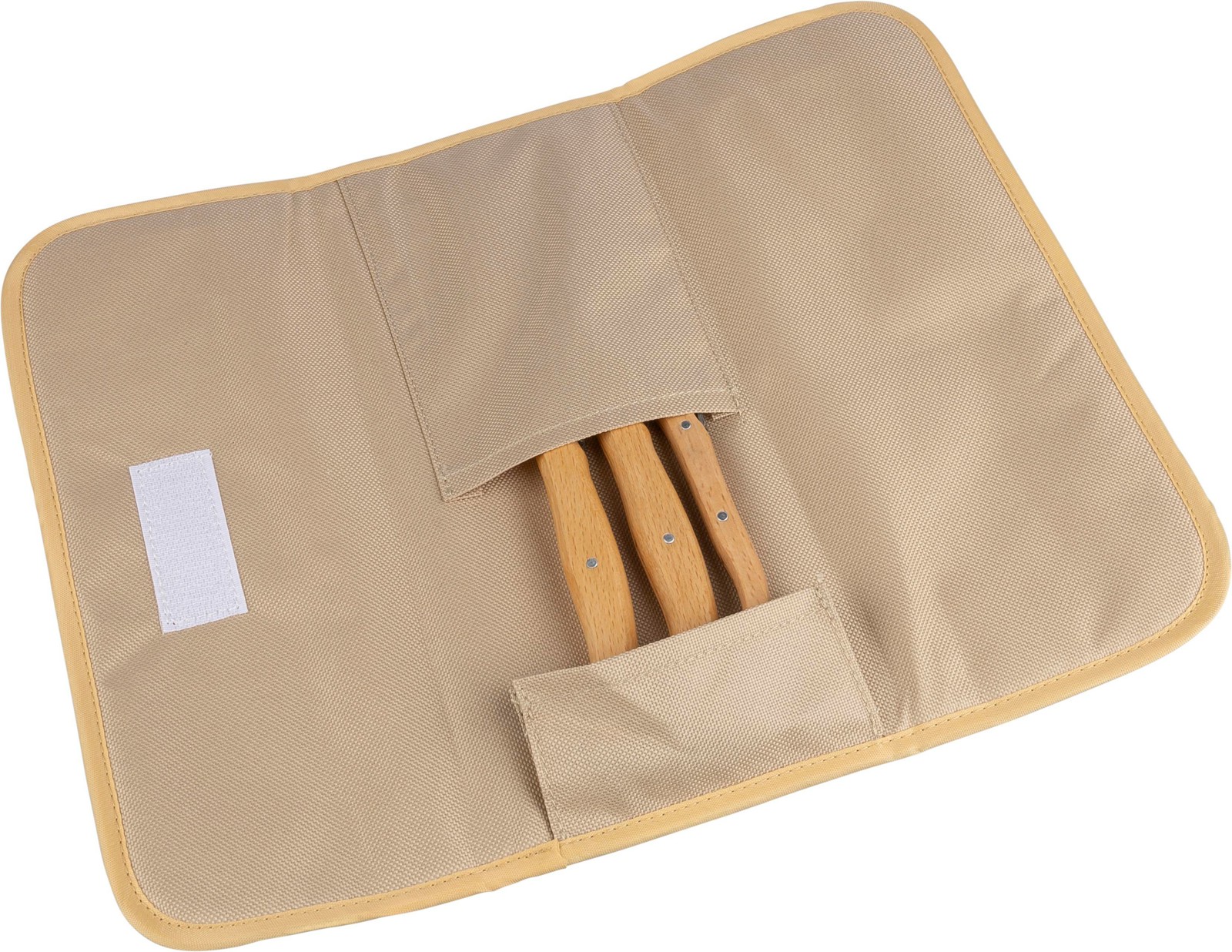 Conjunto de charcutaria rPET numa bolsa de 600D com velcro, incluindo três facas de aço inoxidável com cabos de madeira. Inclui uma etiqueta rPET no interior. Seguro para alimentos. Embalado individualmente numa caixa de cartão castanha.
