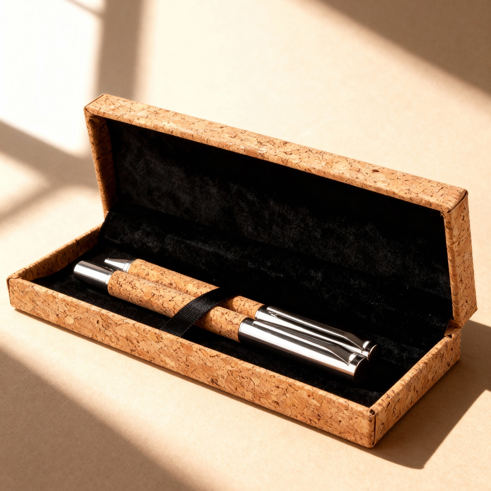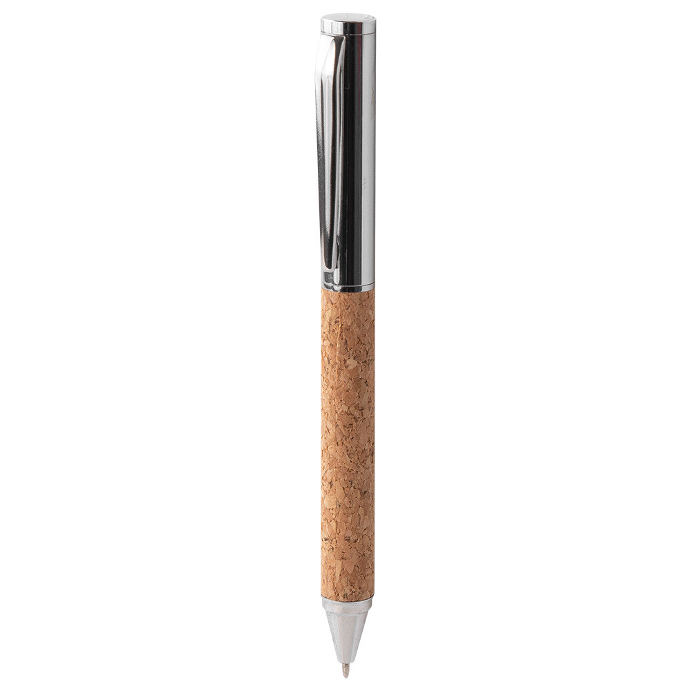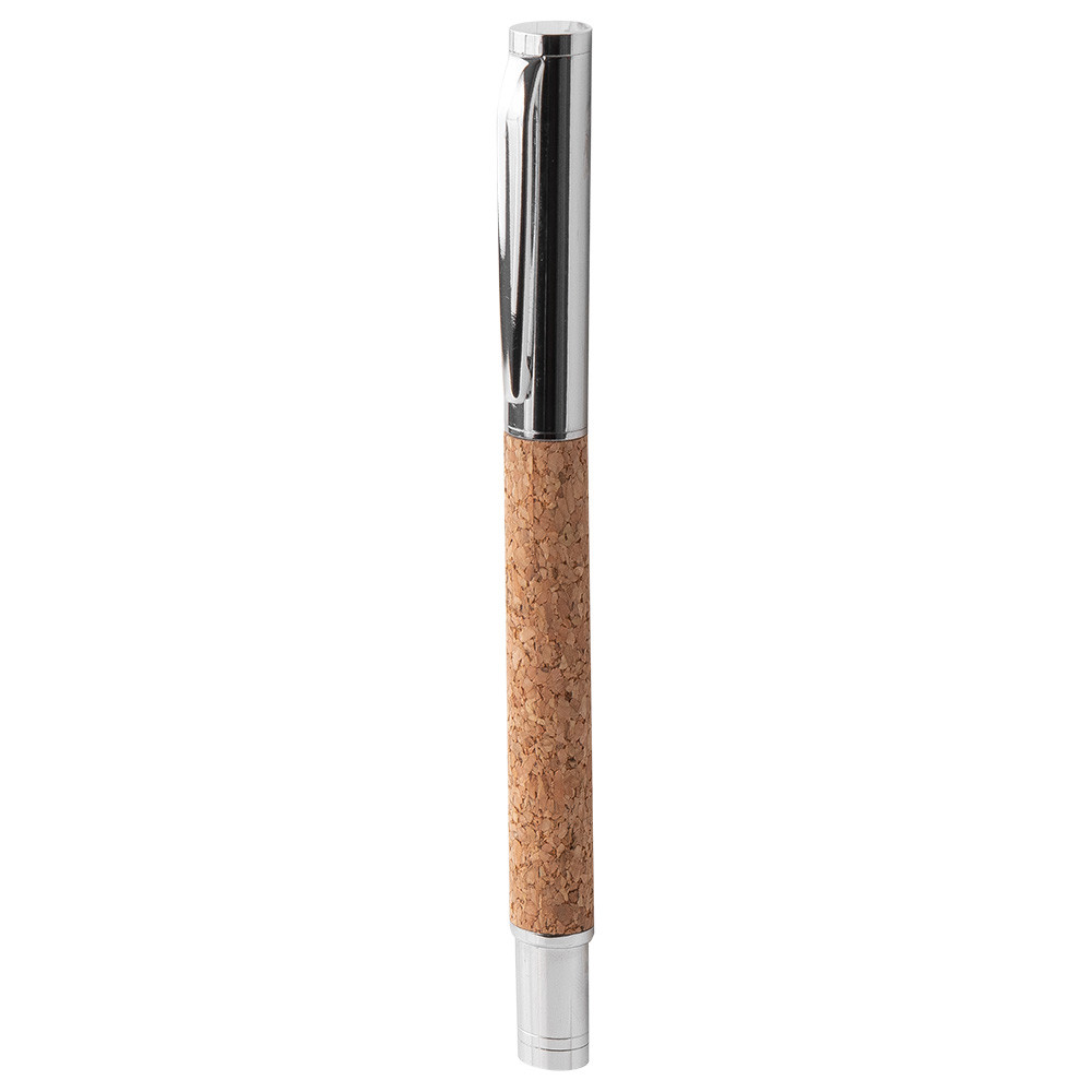 Conjunto de cortiça com esferográfica e roller, ambos com corpo metálico e cortiça. Esferográfica Twist com tinta azul e roller com tampa e tinta preta.